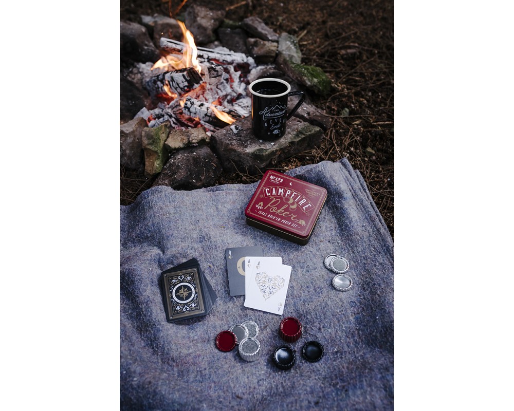 Nuotio Texas Hold'em pokeri setti näppärässä metalli laatikossa. Settiin kuuluu vedenkestävät pelikortit, kasattavat metalli pullonkorkki pelimerkit ja ohjeet.