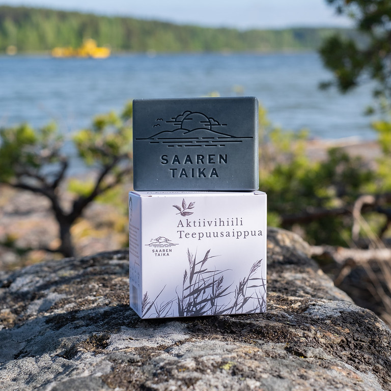 Saaren Taika Aktiivihiili Teepuusaippua on antibakteerinen ja luonnollinen palasaippua, joka sopii päivittäiseen pesuun niin kasvoille, kuin vartalollekin. Hellävarainen saippua tasapainottaa ihosi bakteerikantaa sekä auttaa hillitsemään mm. näppyjä ja kutinaa.