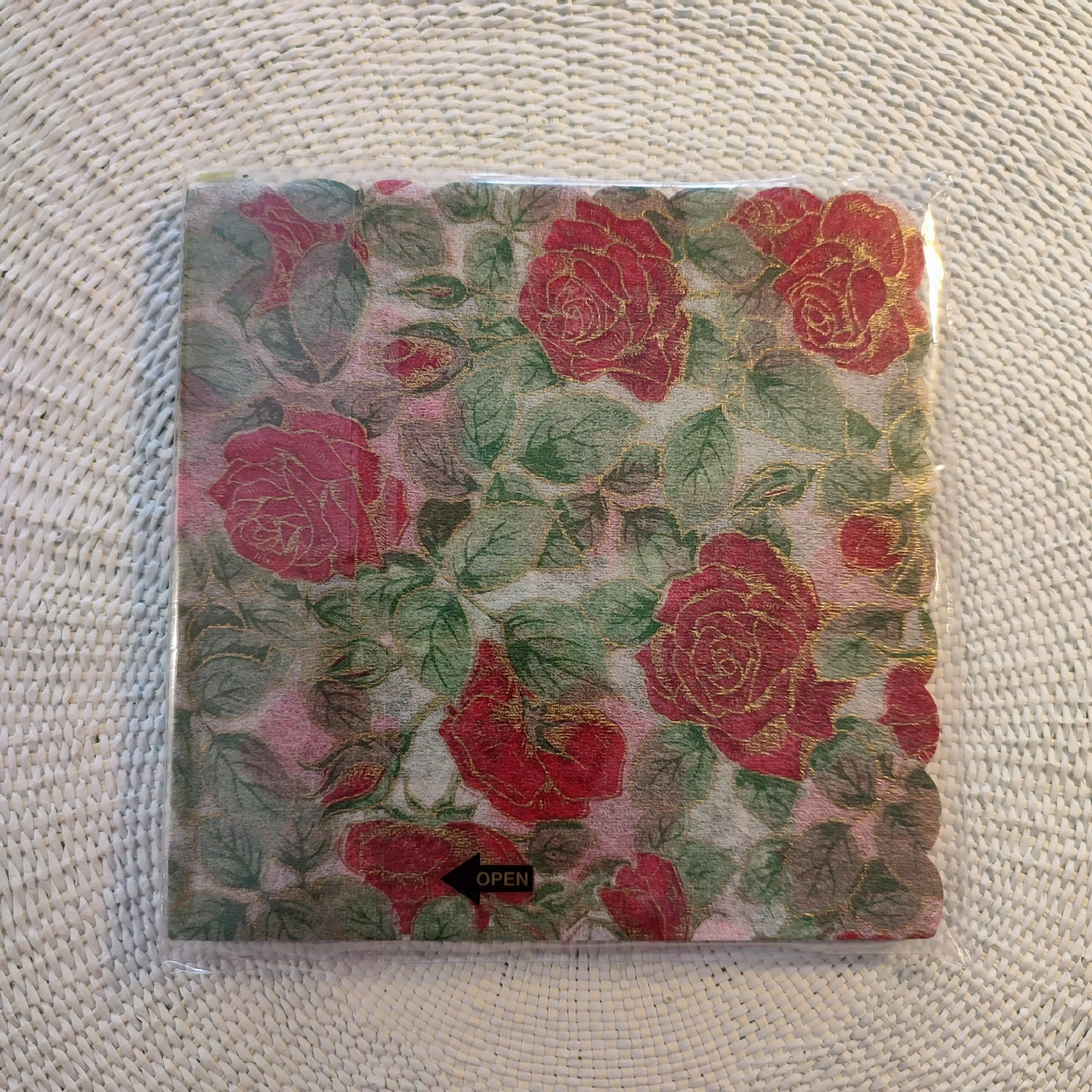 Ihanan ohut 1-kerroksinen japanilainen kahviservetti. Servetissä on punaisia ruusuja kultaisella korostuksella.