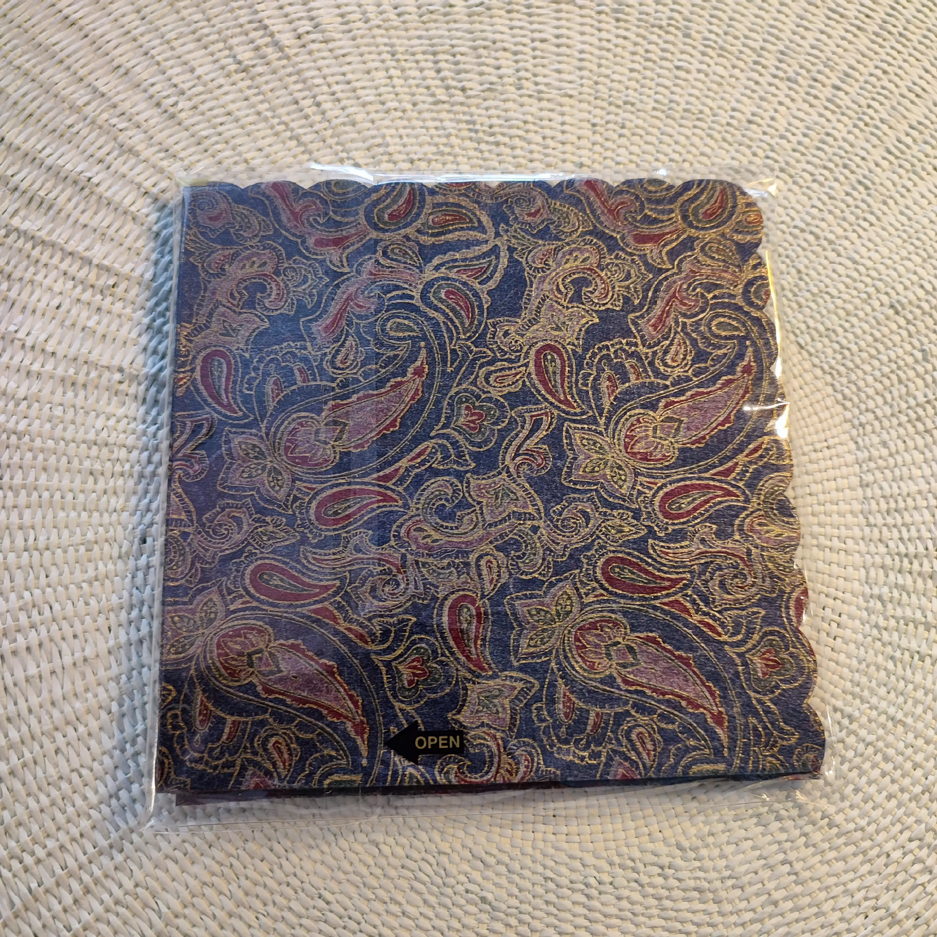 Ihanan ohut 1-kerroksinen japanilainen kahviservetti. Servetissä on lehtimäisiä kuvioita tummansinisellä pohjalla.