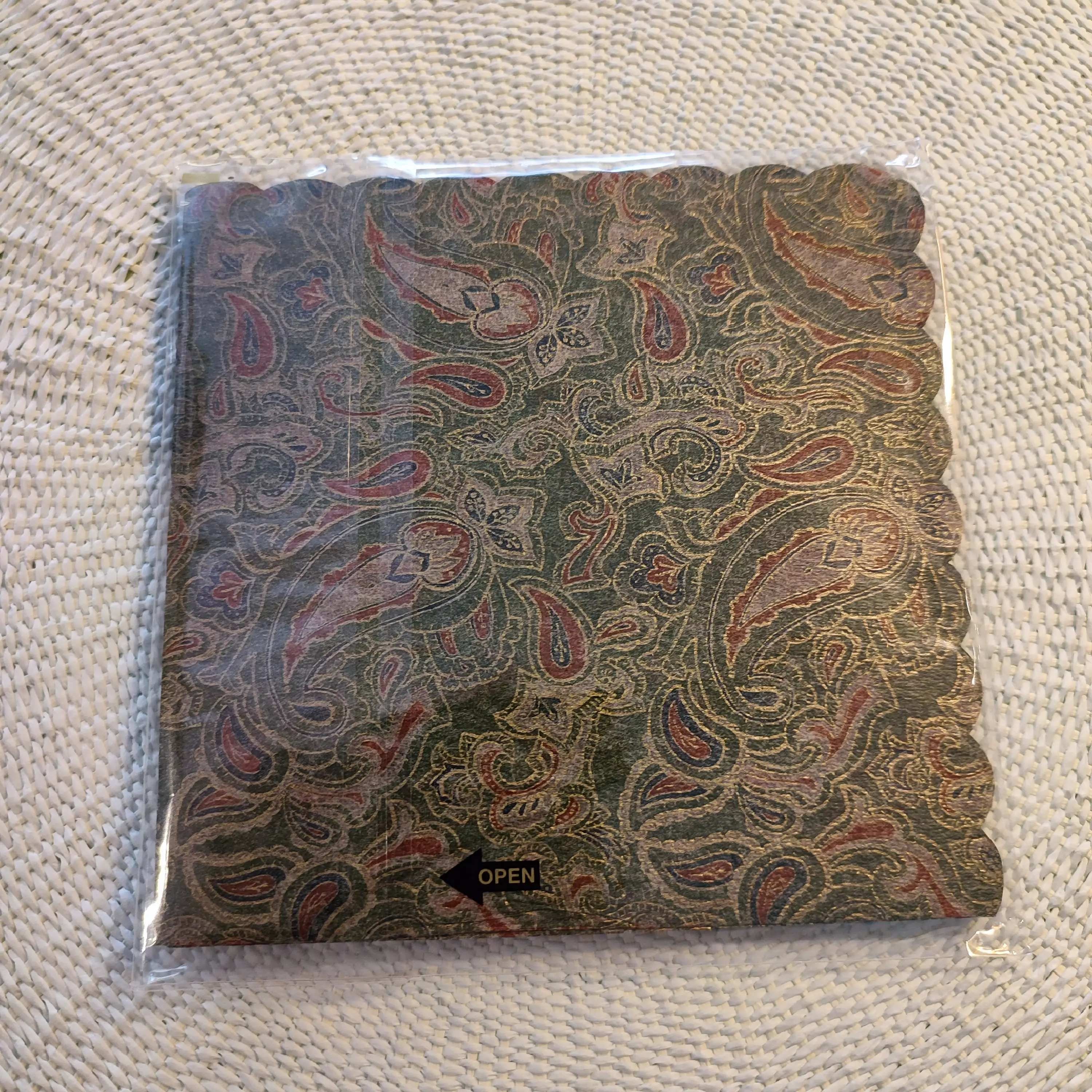 Ihanan ohut 1-kerroksinen japanilainen kahviservetti. Servetissä on lehtimäisiä kuvioita tummanvihreällä pohjalla.