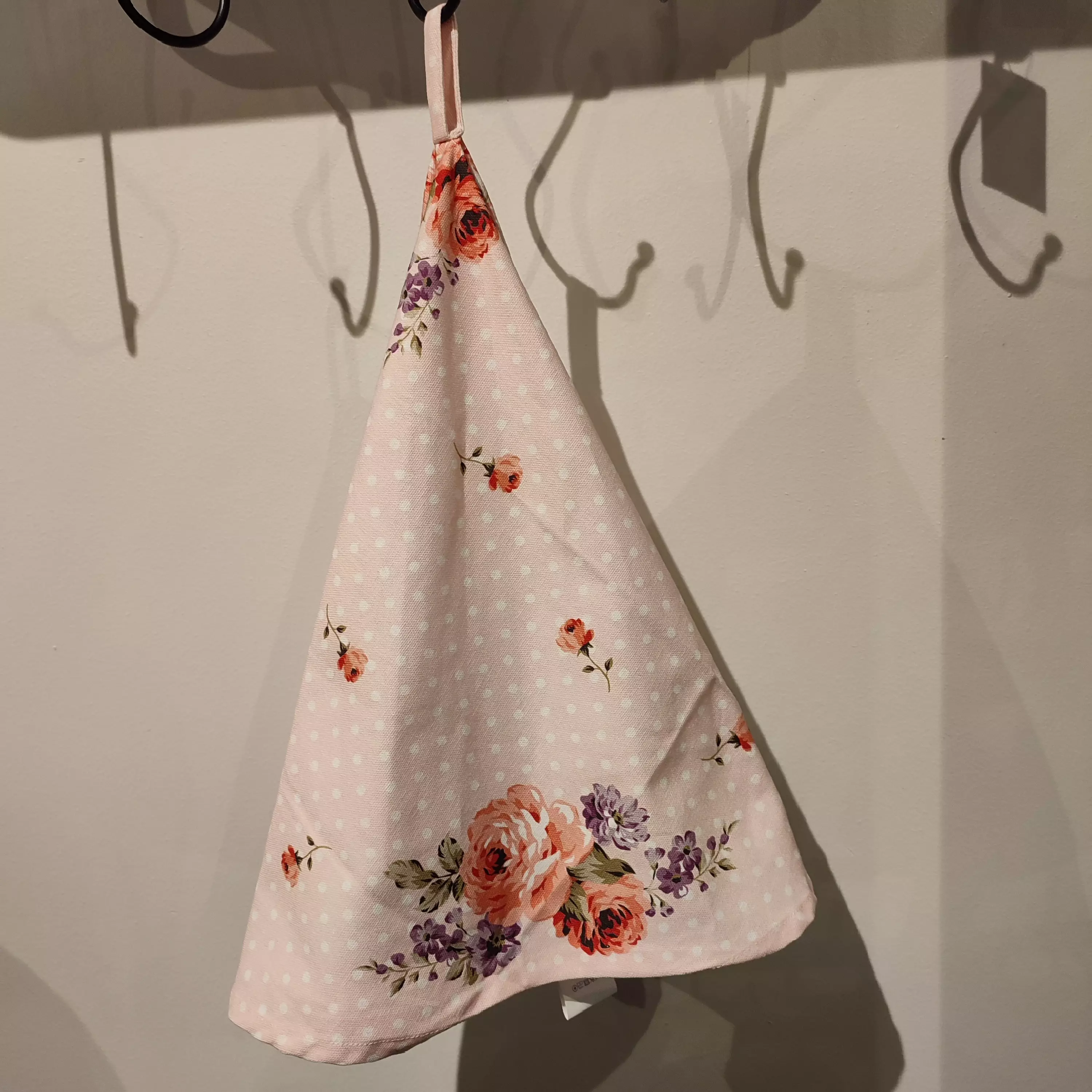 Hempeä vaaleanpunainen keittiöpyyhe, jossa valkoisia pilkkuja ja kukkia. Pyöreän pyyhkeen keskellä ripustuslenkki.