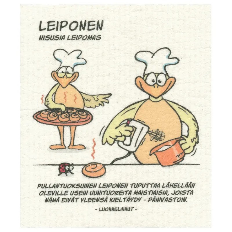 "Leiponen" kompostoituva tiskirätti. Hauskat Luonnelinnut suunnitellut Petri Törmänen. Valmistettu Suomessa. Voidaan pestä koneessa 60°C.