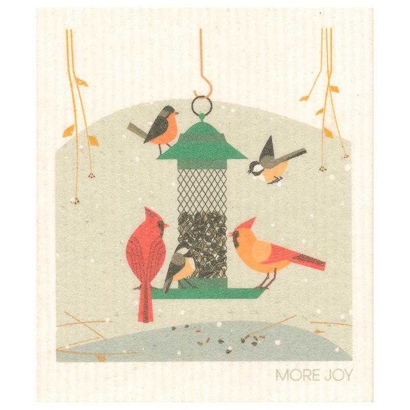 Kompostoituva tiskirätti, jossa lintuja syöttöautomaatilla. Suunniteltu ja valmistettu Suomessa. Design by Eila Lampi. Voidaan pestä koneessa 60°C.