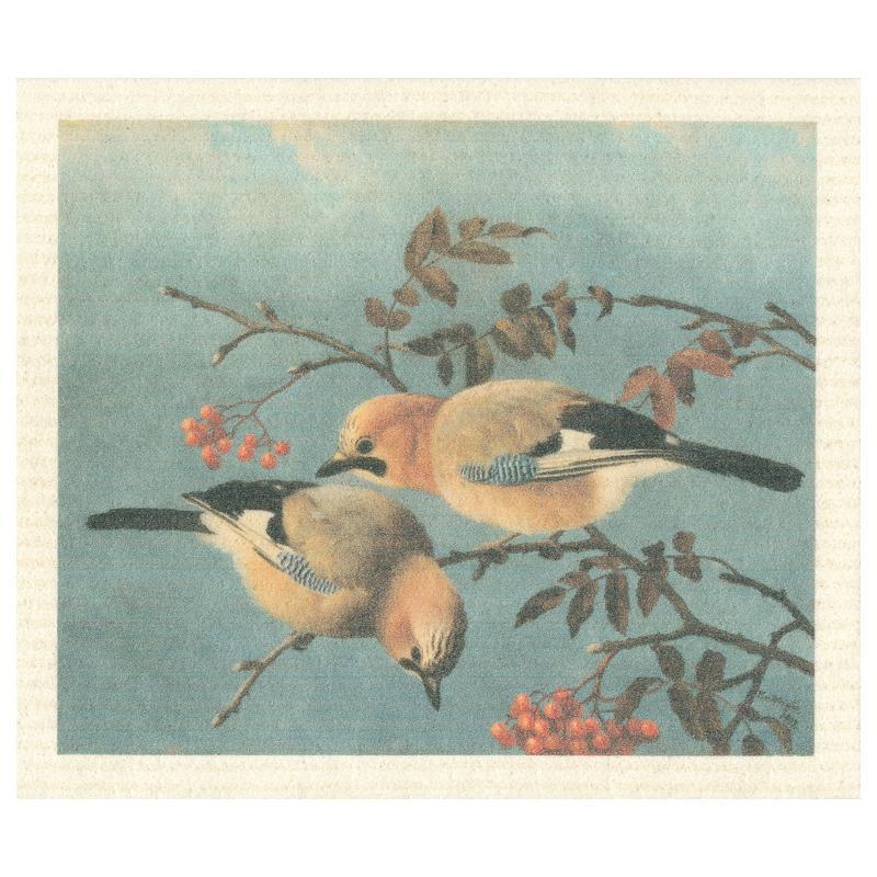 Kompostoituvassa tiskirätissä närhet pihlajan oksilla. Valmistettu Suomessa. Voidaan pestä koneessa 60°C.