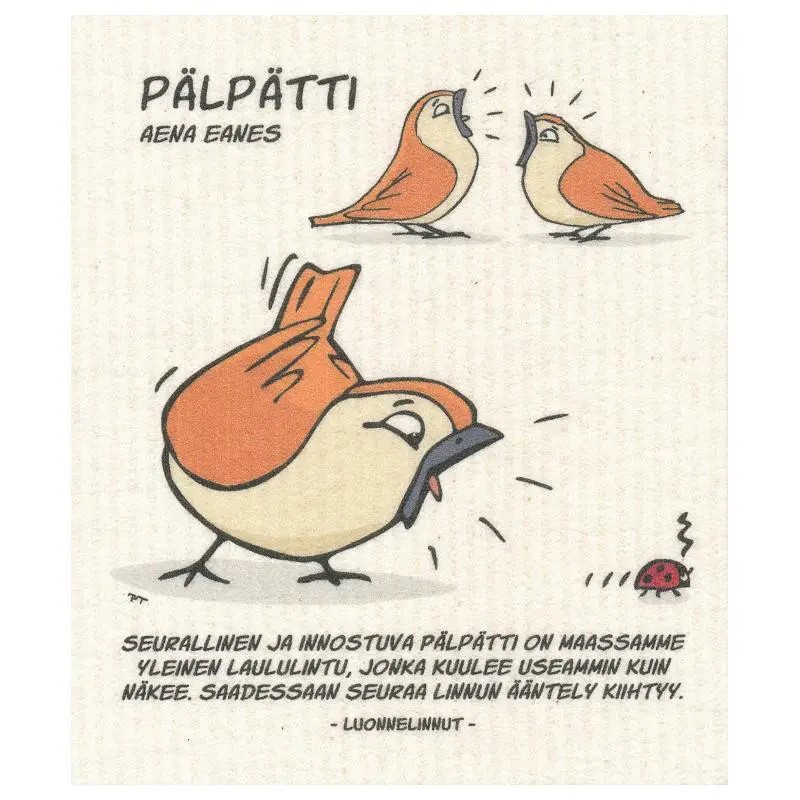 "Pälpätti" kompostoituva tiskirätti. Hauskat Luonnelinnut suunnitellut Petri Törmänen. Valmistettu Suomessa. Voidaan pestä koneessa 60°C.