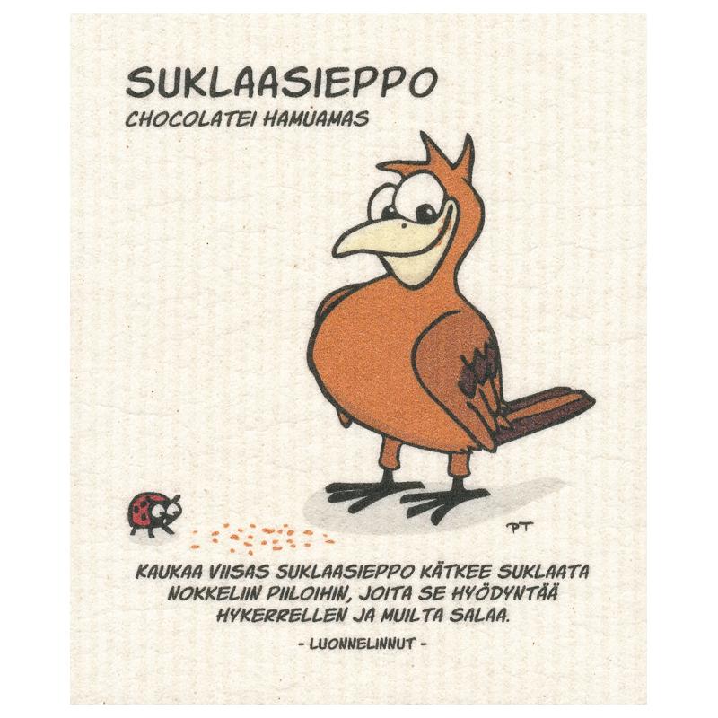 "Suklaasieppo" kompostoituva tiskirätti. Hauskat Luonnelinnut suunnitellut Petri Törmänen. Valmistettu Suomessa. Voidaan pestä koneessa 60°C.
