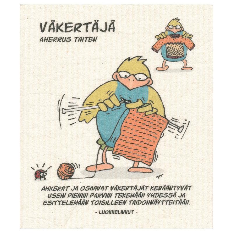 "Väkertäjä" kompostoituva tiskirätti. Hauskat Luonnelinnut suunnitellut Petri Törmänen. Valmistettu Suomessa. Voidaan pestä koneessa 60°C.