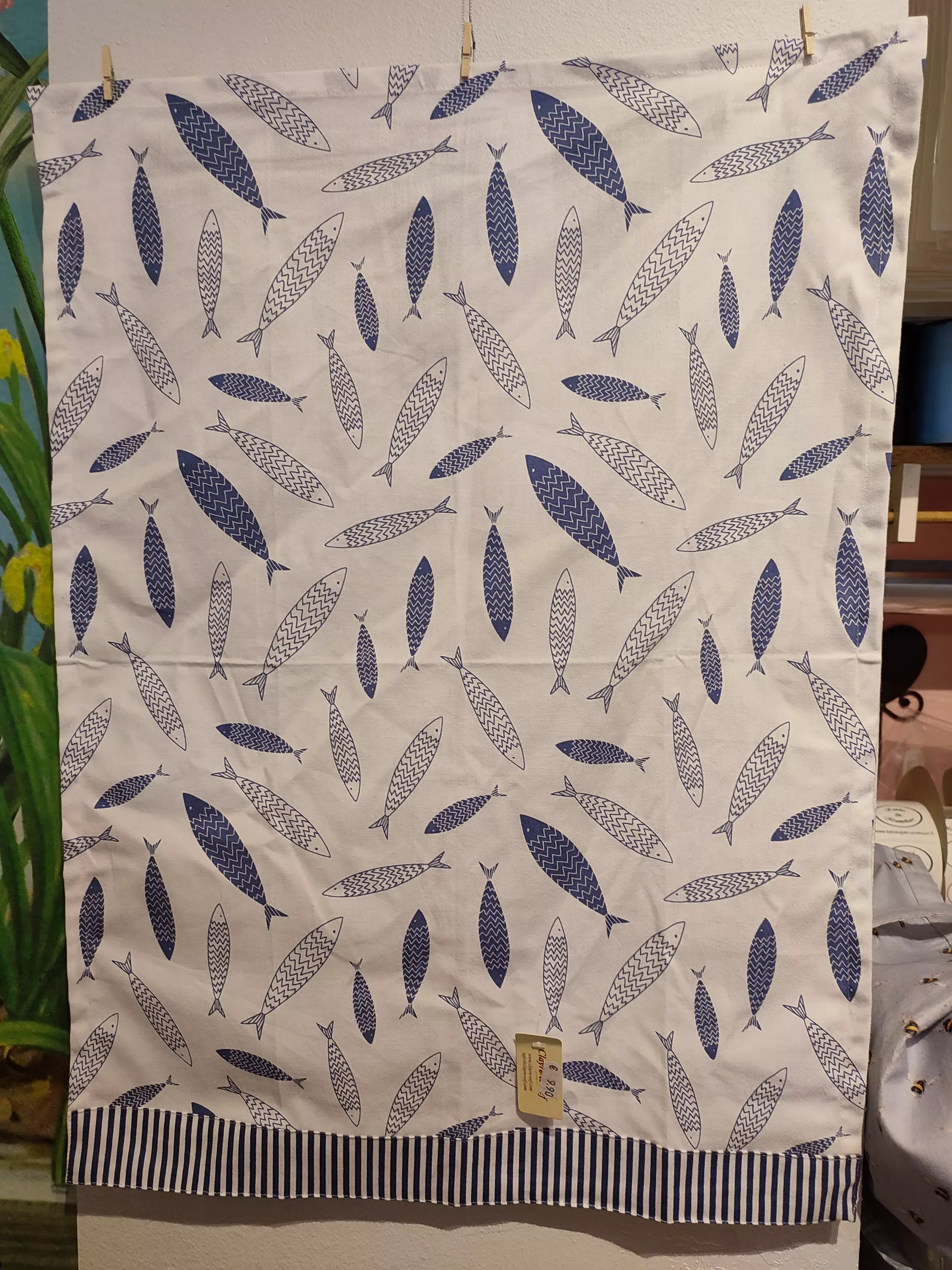 Suorakulmainen kalakeittiöpyyhe, jossa alareunassa sini-valkoraidallinen koristereuna. Takana yläkulmassa ripustuslenkki. Materiaali 100% puuvilla. Pesu 30° C. Pyyhkeen koko 50x70 cm.... Lue lisää