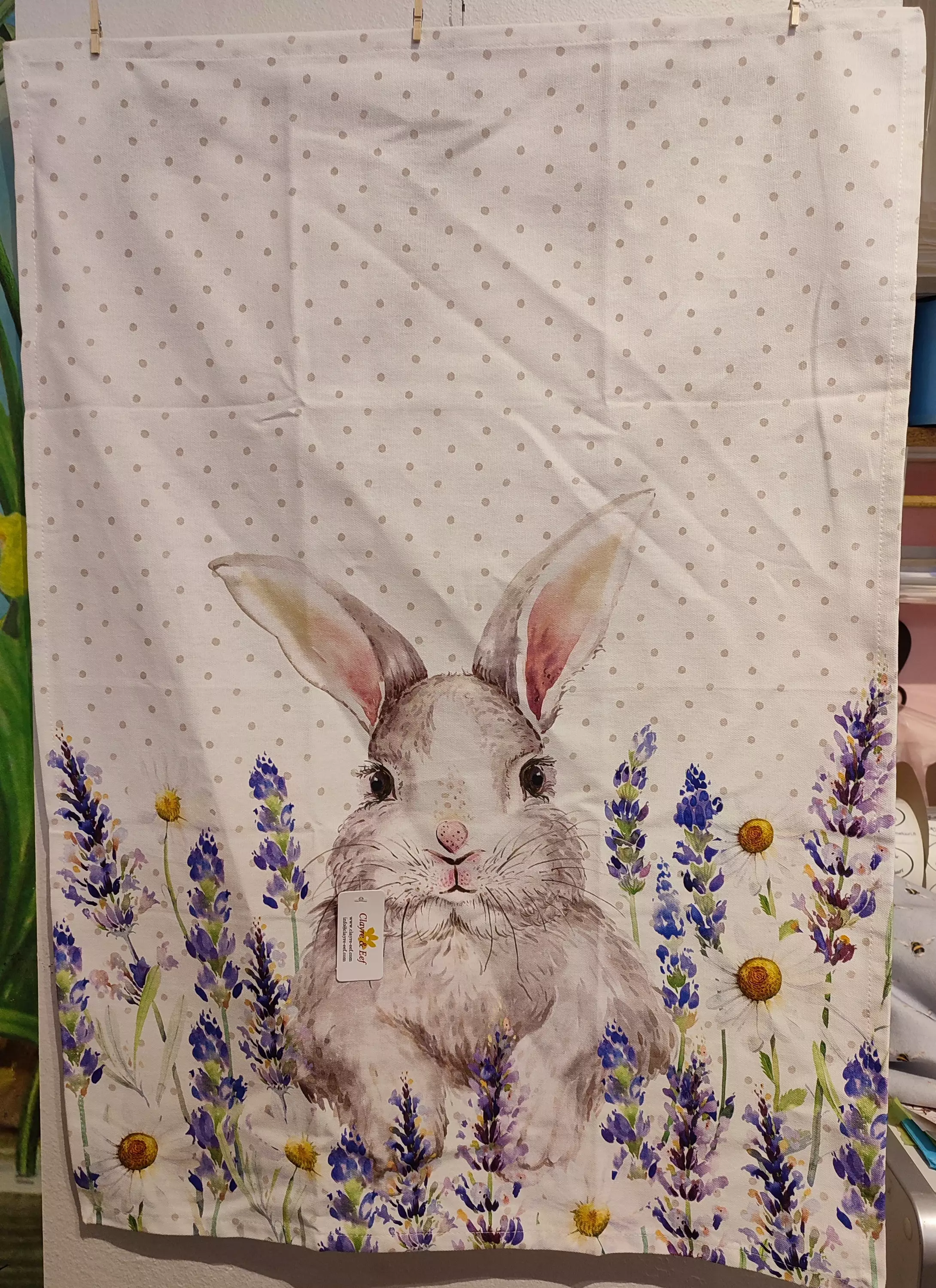 Ihana pilkullinen keittiöpyyhe, jossa iso vaalea pupu kukkien keskellä. Takana yläkulmassa ripustuslenkki. Materiaali 100% puuvilla. Pesu 30° C. Pyyhkeen koko 50x70 cm.