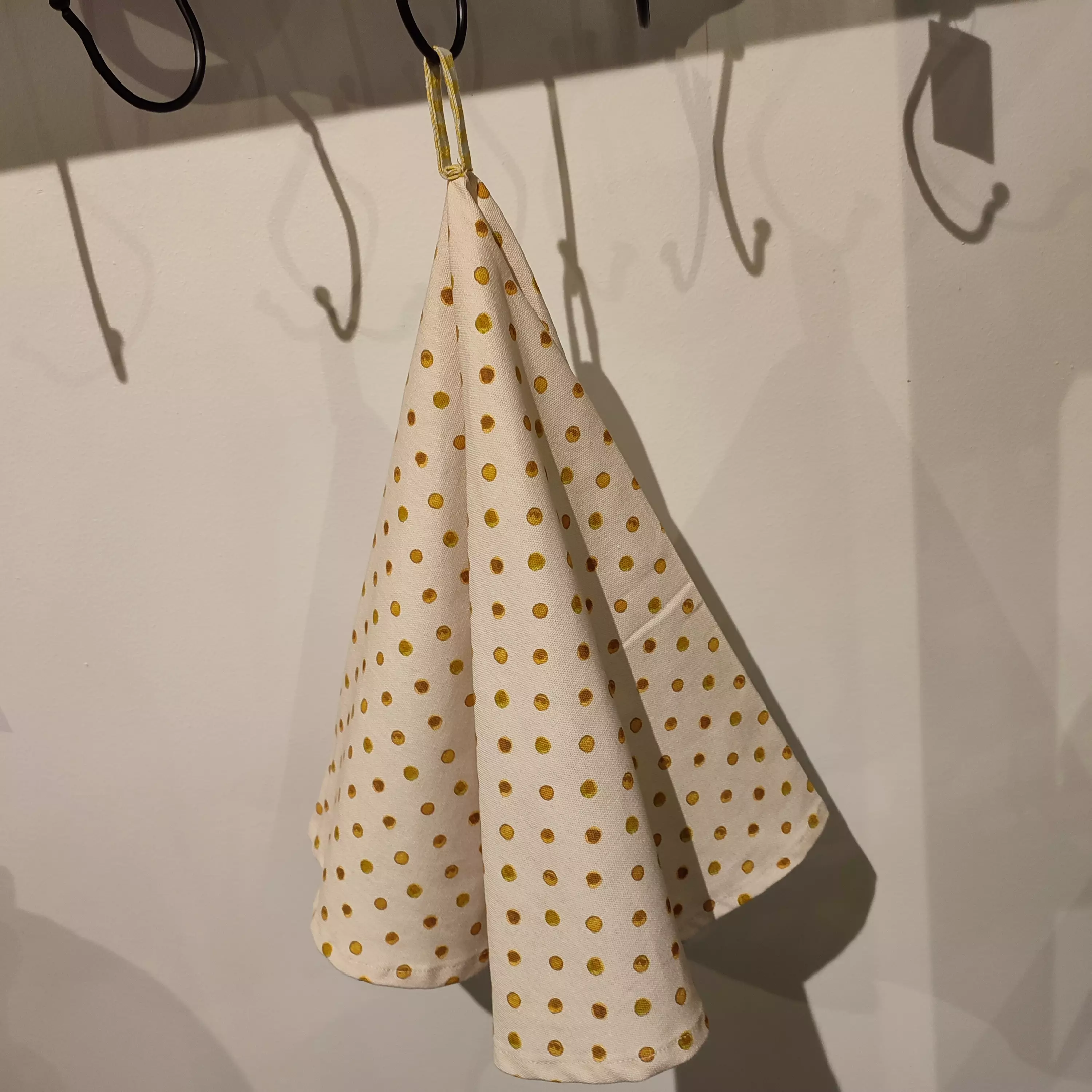 Pyöreä beige keittiöpyyhe, jossa keltaisia pilkkuja. Pyyhkeen keskellä beige-keltaraidallinen ripustuslenkki.