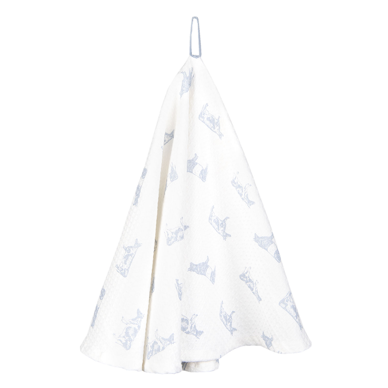 Pyöreä vohvelikankainen keittiöpyyhe sinisillä lehmän kuvilla. Keskellä sininen ripustuslenkki.