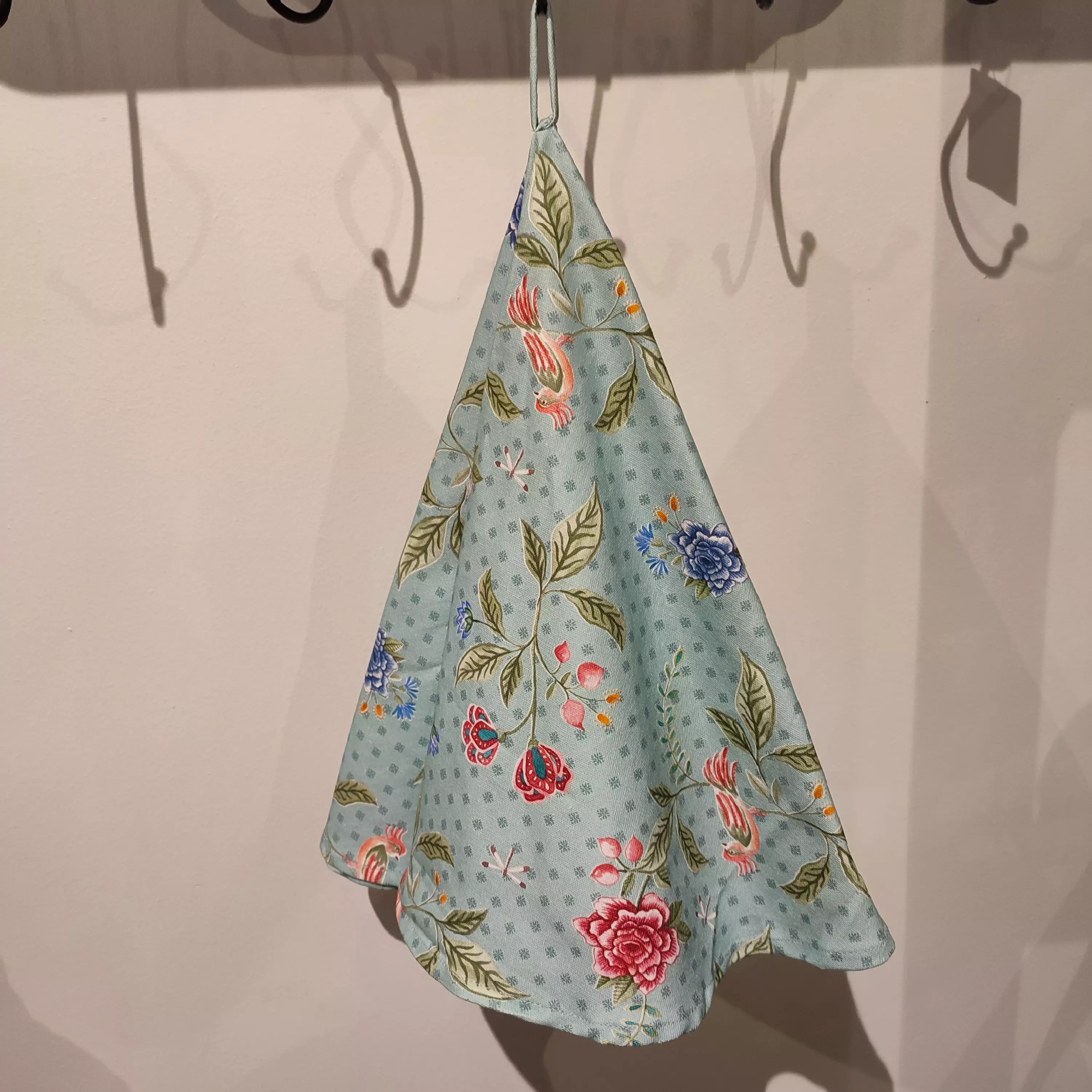 Pyöreä turkoosi pyyhe, jossa erilaisia kukkia, sudenkorentoja ja lintuja. Pyyhkeen keskellä ripustuslenkki.