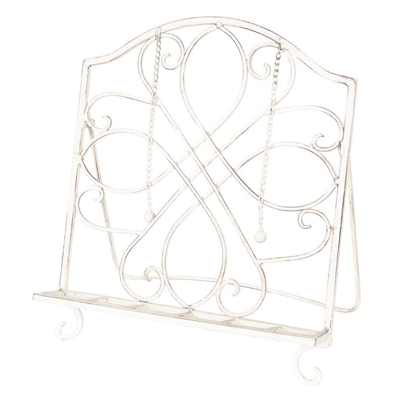 Kaunis kirjateline / nuottiteline / keittokirjateline. Metallinen teline on vaalean harmaa ja siinä on kaksi painollista ketjua sivun paikallaan pitämiseksi. Telineen koko on 37x31x25 cm.