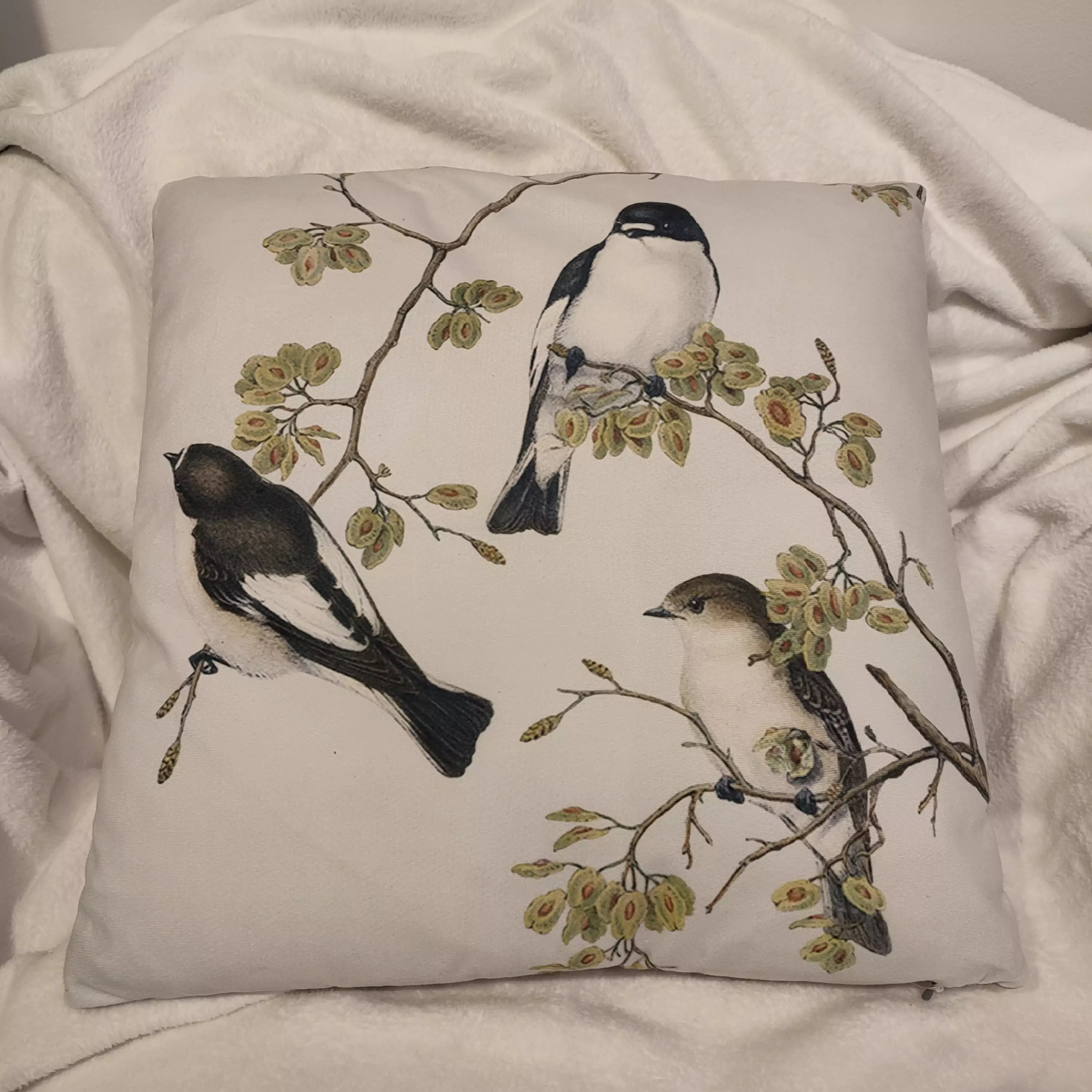 Samettisen pehmeä vaalea koristetyyny, jossa kolme lintua istuu oksilla. Tyynyn toinen puoli harmaa. Sivusaumassa vetoketju. Mitat 45x45cm.