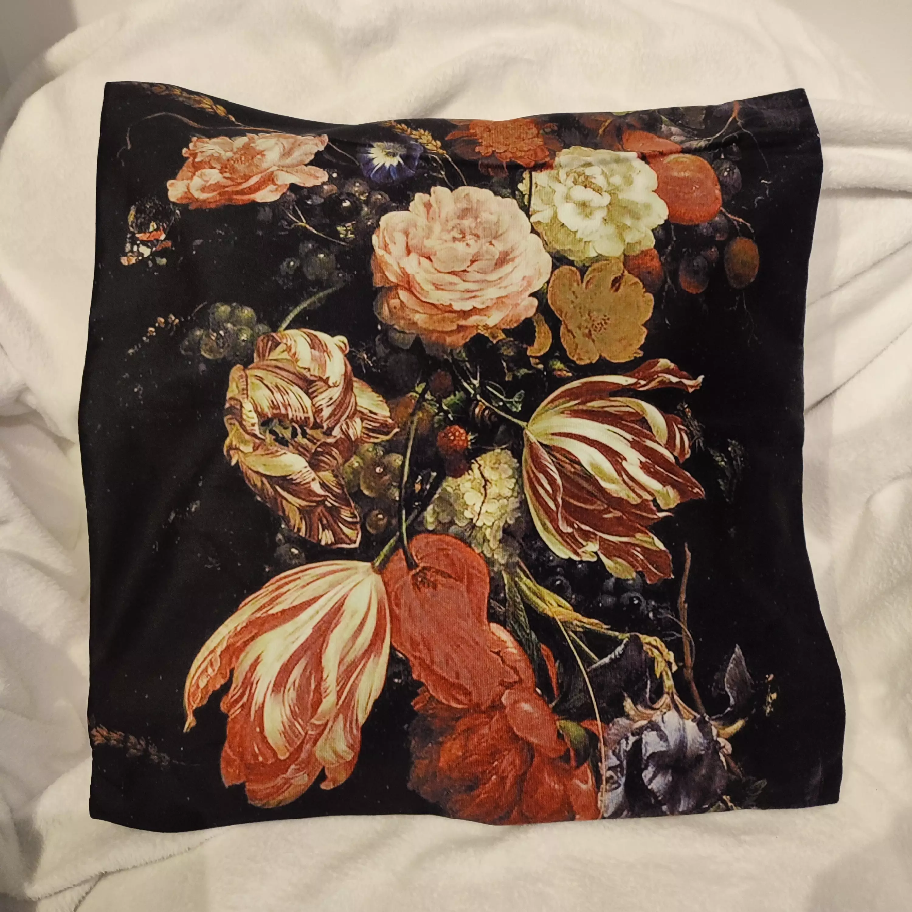 Samettisen pehmeä tummasävyinen tyynynpäällinen, jossa molemmin puolin kukkakuva. Sivusaumassa vetoketju.