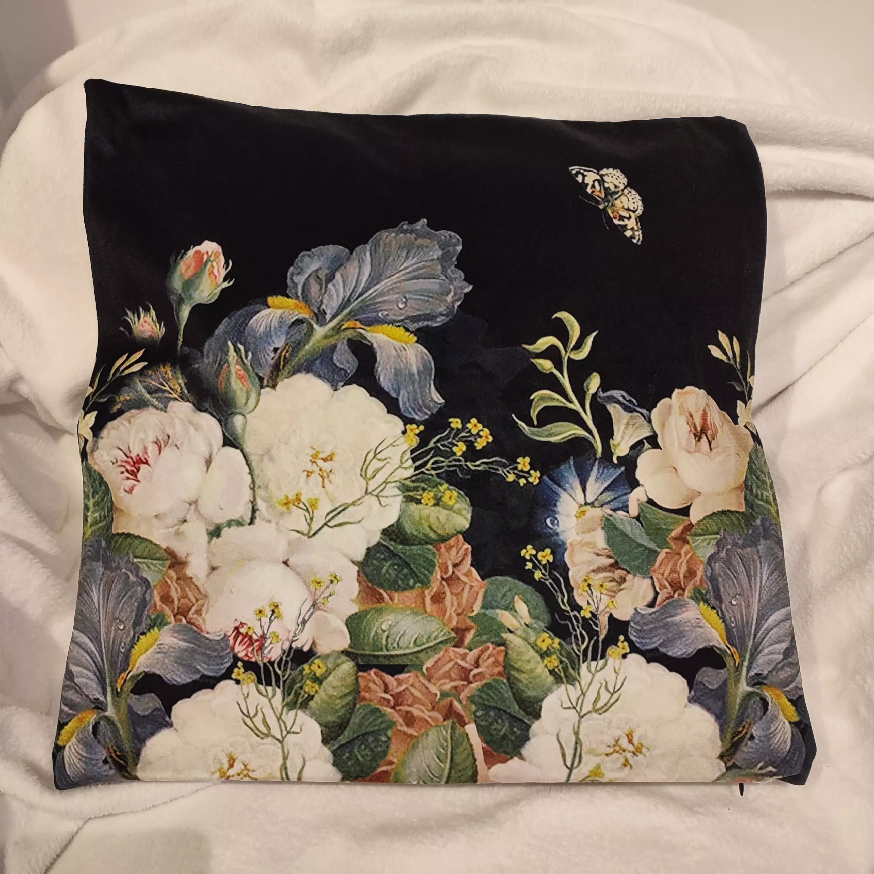 Tumma kukallinen samettisen sileä koristetyynynpäällinen. Koko 45x45cm. Huomaamaton vetoketju sivusaumassa. Materiaali 100% polyesteri. Pesu 30°C.