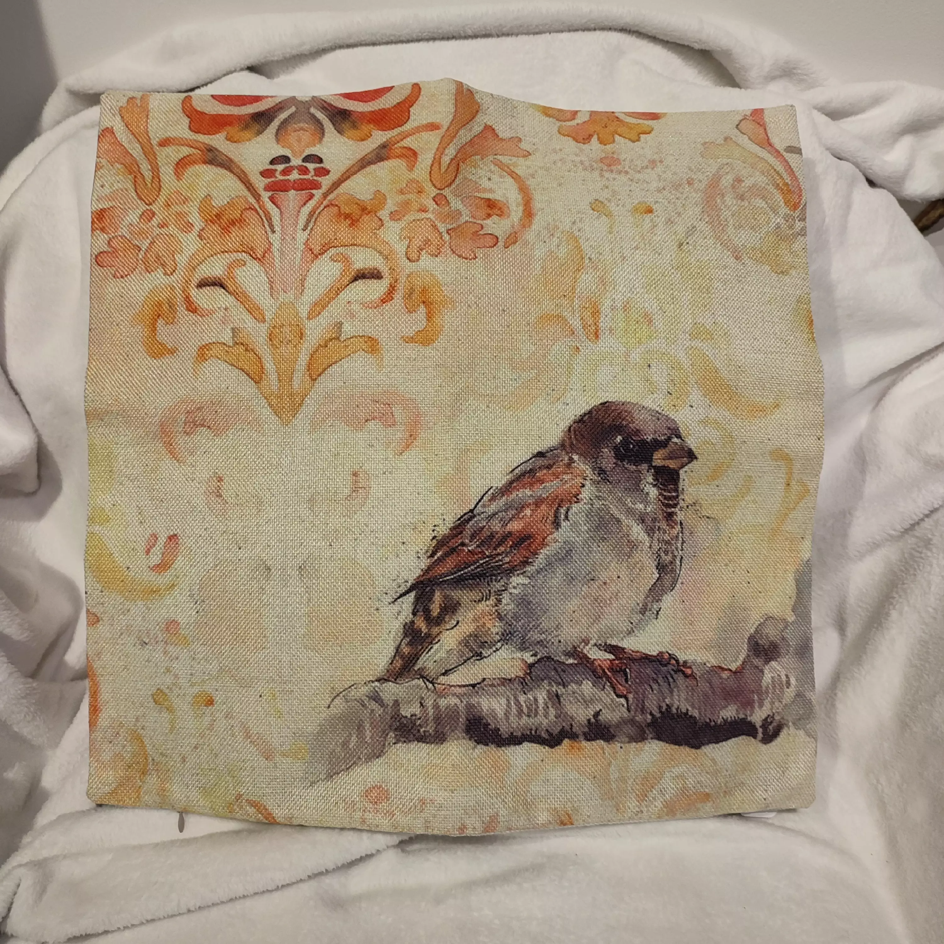 Koristetyynynpäällisessä varpunen oksalla ja oranssia koukerokuviointia. Koko 45x45cm. Vetoketju sivusaumassa. Materiaali 100% polyesteri. Pesu 30°C.