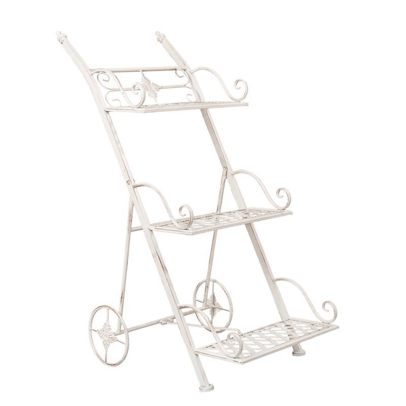 Kaunis kukkateline valkoista metallia. Telineessä on kolme tasoa ja siinä on koristepyörät (eivät pyöri). Tasojen leveys on n. 32 cm ja syvyys n. 15cm. Koko telineen koko on 50 x 37 x 82 cm.... Lue lisää