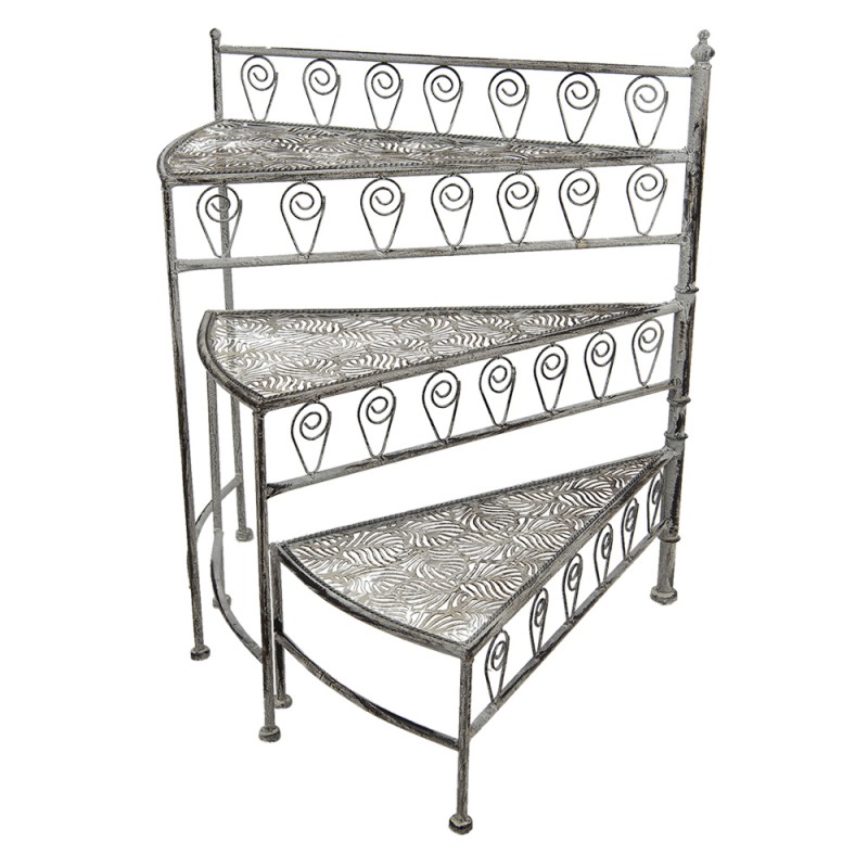 Kaunis portaikko kukkateline, metallia. Telineessä on kolme porrasta, jotka liikkuvat vapaasti keskitolpan ympäri ja voit asetella tasot haluamaasi asentoon. Pienimmillään teline on yhden tason levyinen.