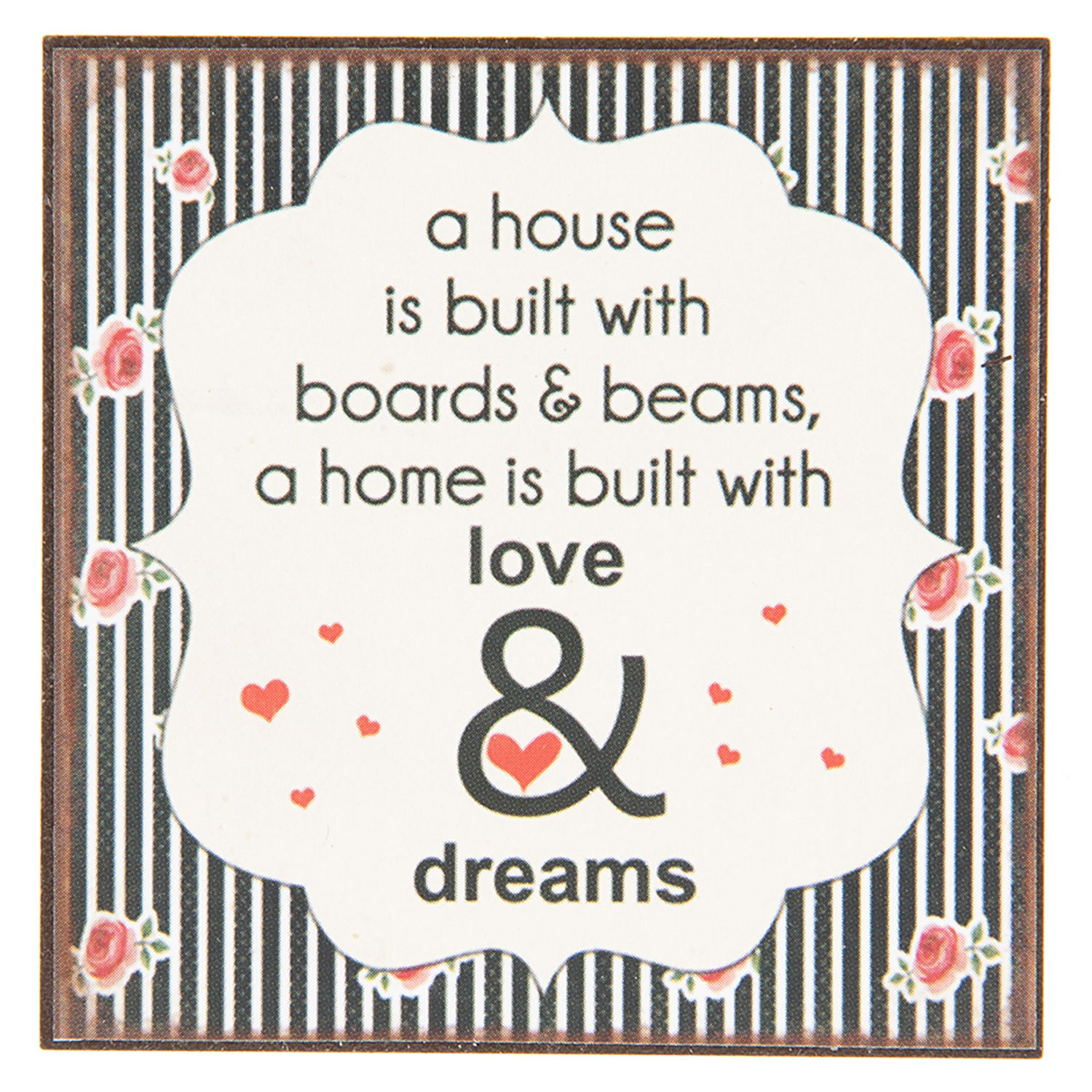Jääkaappimagneetti teksillä "A house is built with boards & beams, home is built with love & dreams." Koko 7x7cm.