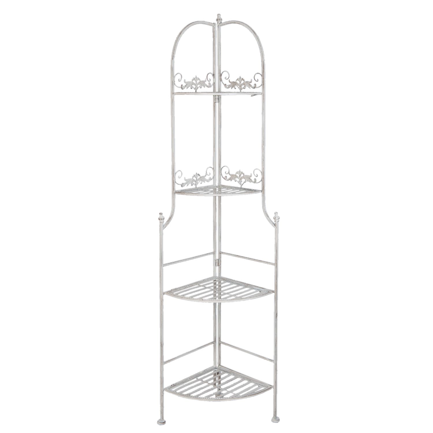 Kaunis kulma metallihyllykkö. Hyllyt taittuvat ylös, ja hylly menee kuljetettaessa pieneen tilaan. Hyllyjä on neljä kappaletta ja ne suurenevat alaspäin. Telineen korkeus on 161 cm ja leveys 50 x 30 cm.