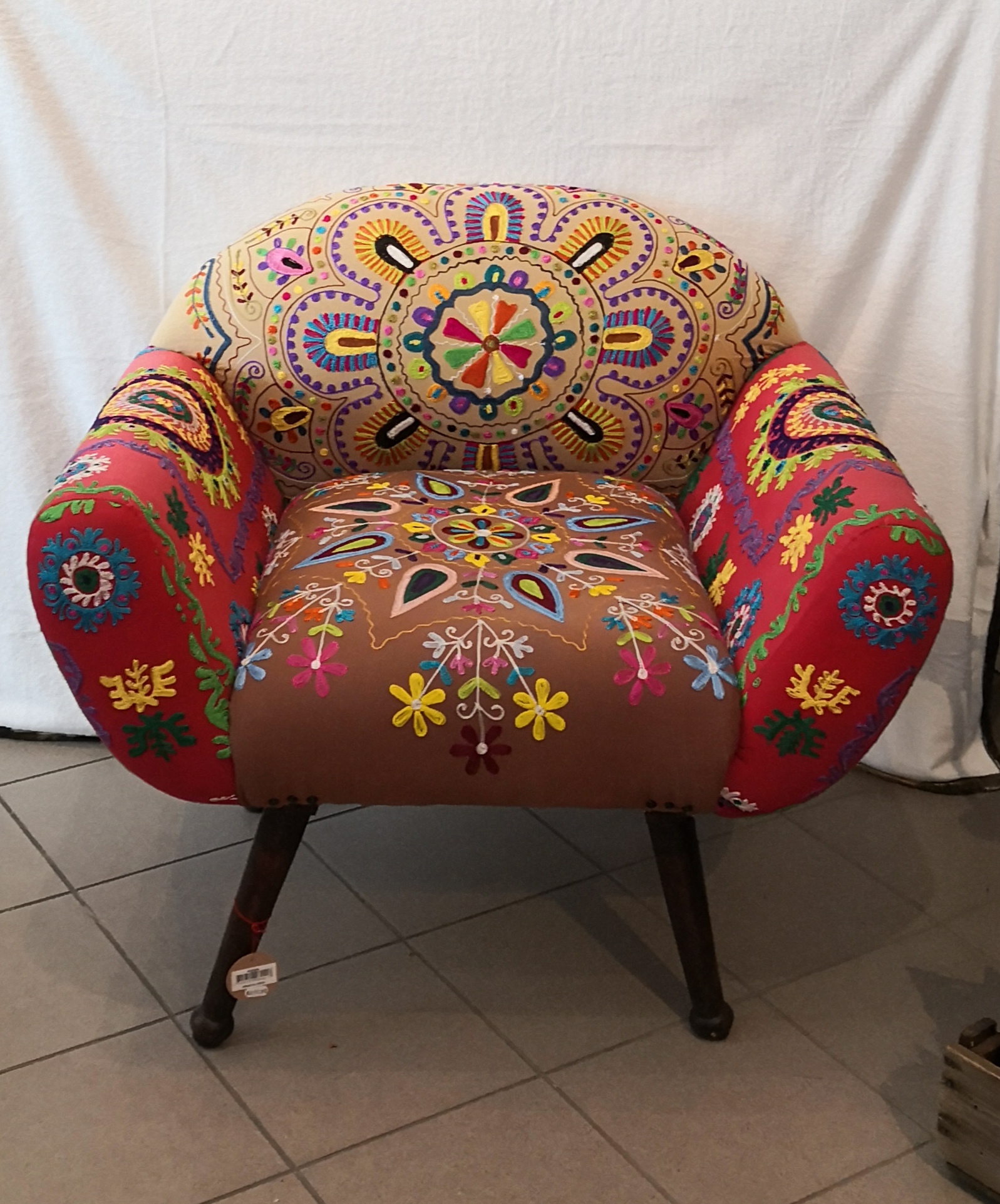 Kaunis Nordal Rajwada nojatuoli. Nojatuolin kangaspinnassa on koristeommellut yksityiskohdat. Kauniit jalat levenevät alaspäin. Leveys 96 cm, syvyys 73 cm, korkeus 85 cm. Istumakorkeus n. 52 cm.... Lue lisää