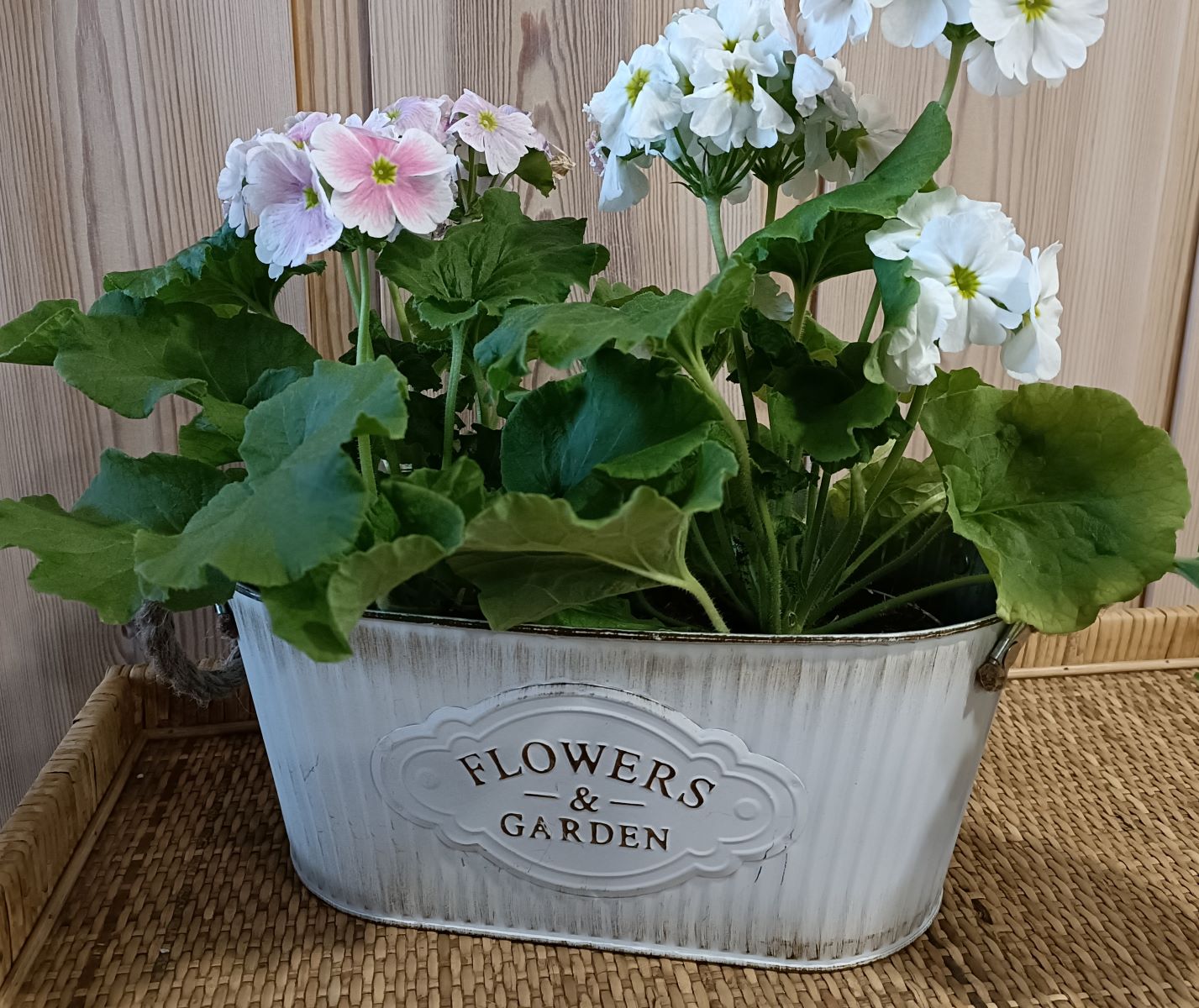 Soikea rustiikkinen peltikukkaruukku, jossa teksti "Flowers and Garden". Juuttinarukahvat. Ruukku ei ole muovitettu eli ei välttämättä ole vedenpitävä. Mitat 29 x 15,5 x 12,5 cm.... Lue lisää
