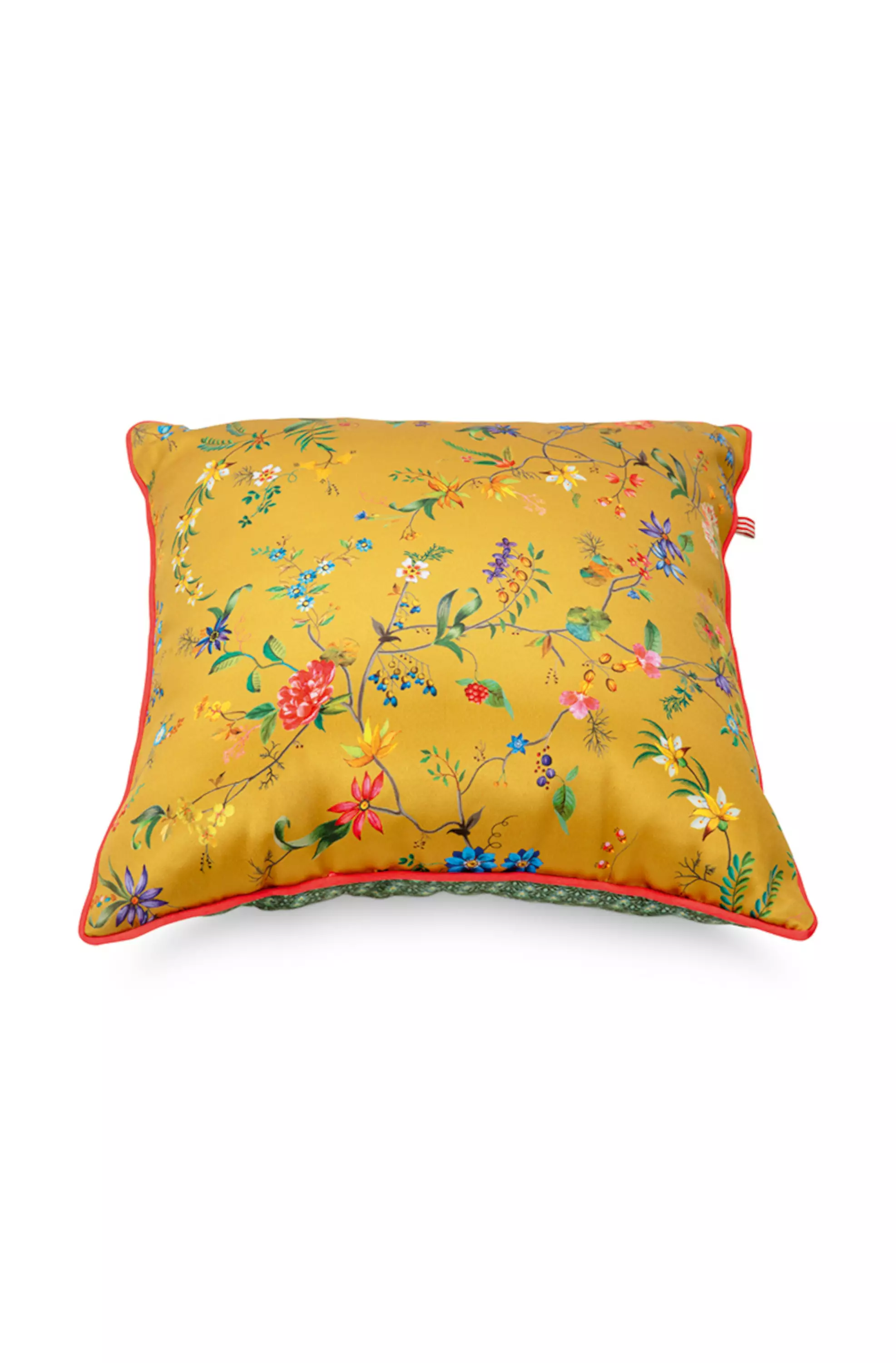 Pirteän keltainen Pip Studion Petites fleurs kukkatyyny. Etupuoli satiininen, takaosa puuvillainen, johon kirjailtu Pip Studion logo. Vetoketju takapuolella.