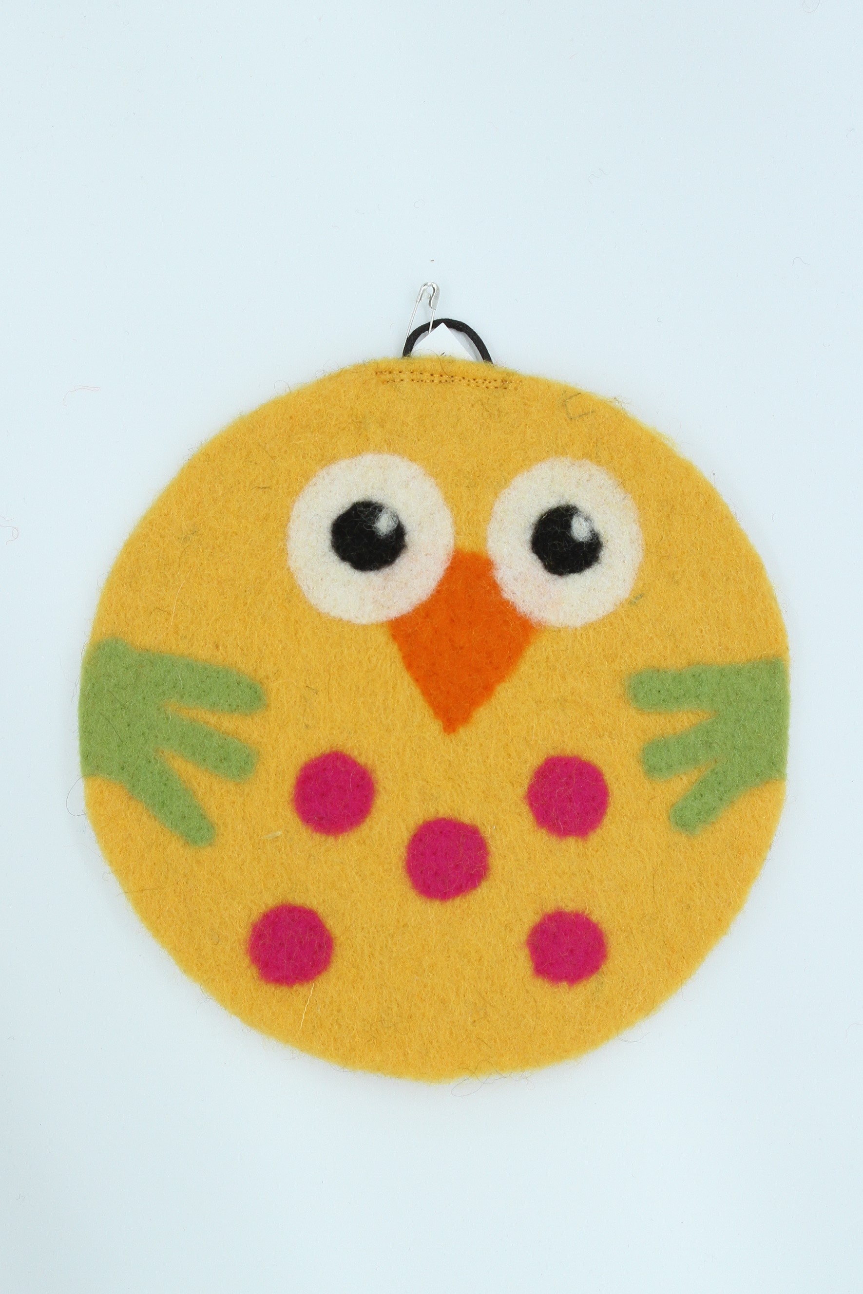 Hurmaava käsinhuovutettu kotimainen värikäs pöllö. Somisteeksi, seinälle, keittiöön, astian alle, pannun aluseksi, patalapuksi tai minne ikinä keksitkin.