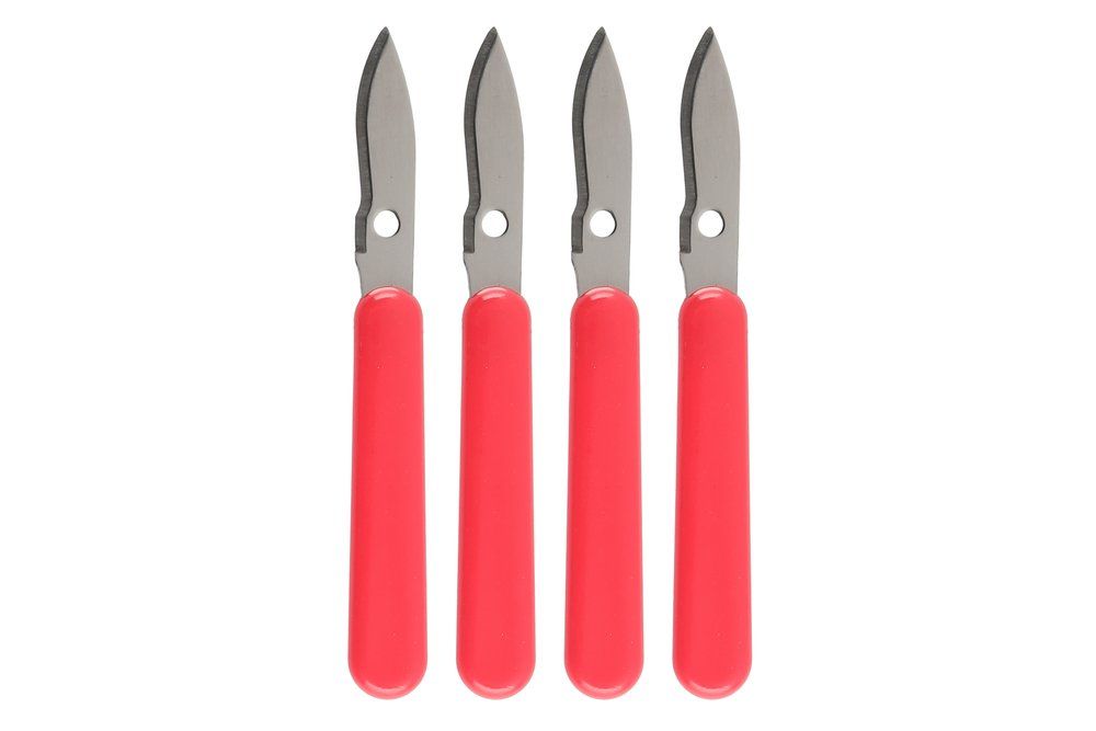 Rapuveitset, joissa lyhyt ja tukeva terä, jolla ravun kuoret saa helposti avattua. Veitsen terässä olevalla pienellä reiällä saa katkaistua saksien päät, jotta pääsee imemään liemen ja syömään niiden sisällä olevan lihan. Paketissa neljä veistä. Veitsen pituus 14 cm. Käsinpesu.