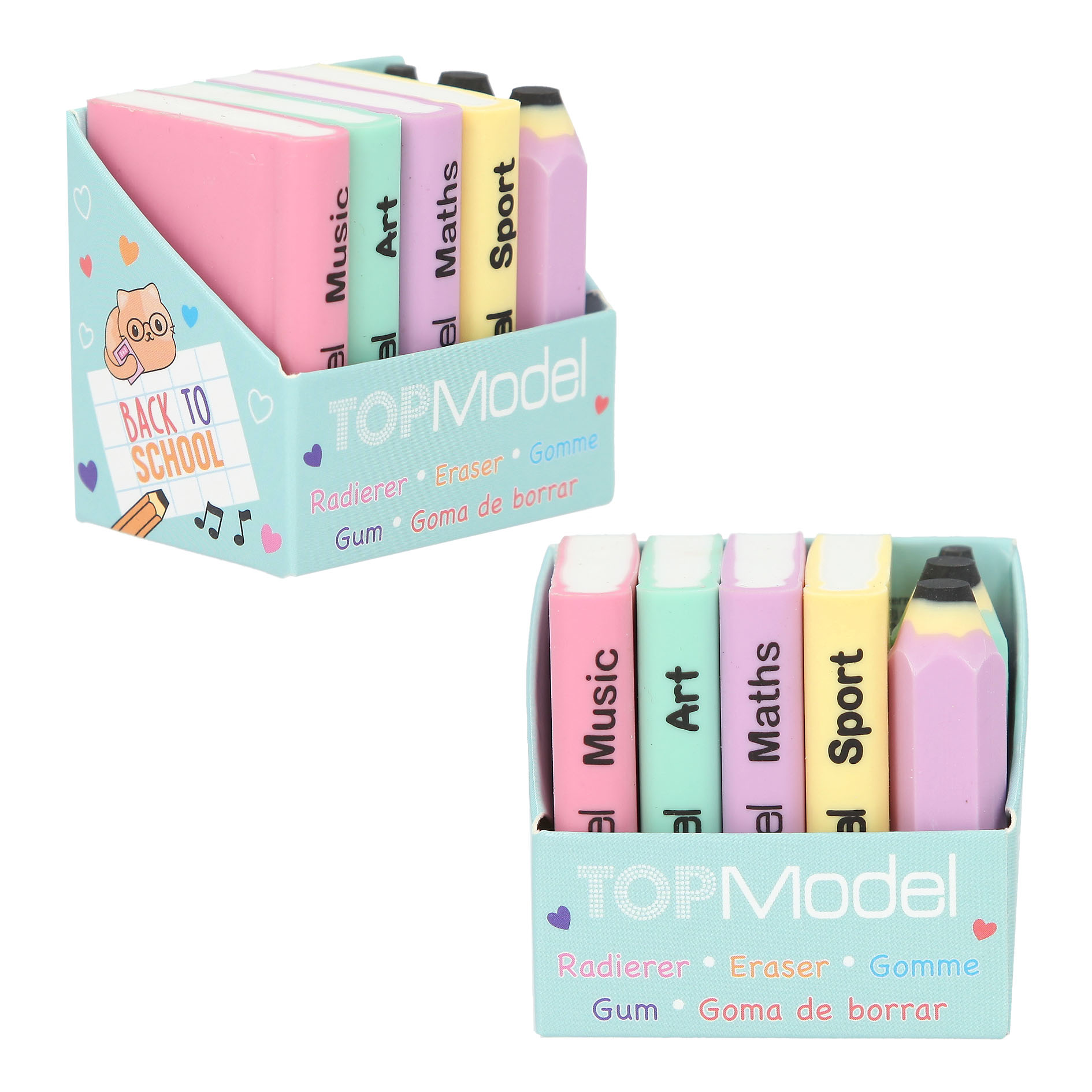 Hauska TOPModel pyyhekumisetti, jossa mukana neljä pikkuista oppikirjapyyhekumia ja kolme värikästä kynäpyyhekumia. Pakkauksen koko 4,5 x 4,3 x 3,3 cm.