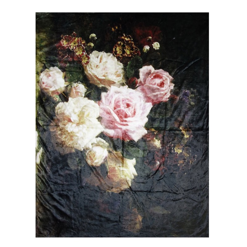 Kaunis torkkupeitto, jossa kukkia mustalla pohjalla. Torkkupeiton kääntöpuoli on valkoinen. Peiton koko on n. 130x170 cm. Materiaali 100% polyesteri.