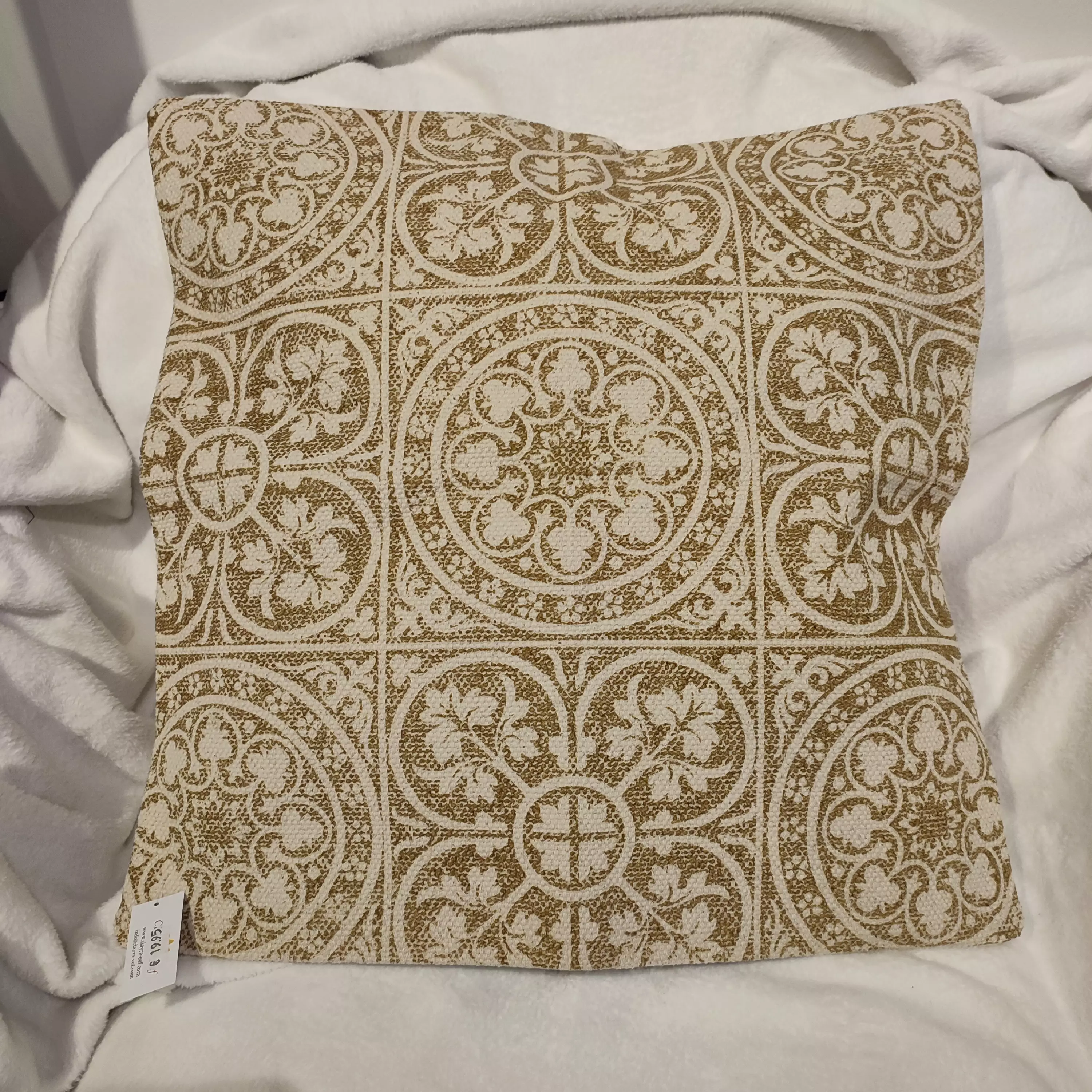 Vaalea mandalakuosinen koristetyynynpäällinen. Etupuolella kuviointi painettu napakalle kankaalle, takaosa valkoinen ja ohuempaa kangasta. Vetoketju takana. Koko 50x50cm. Materiaali 100% puuvilla. Pesua ei suositella, pyyhi lika kostealla rätillä.