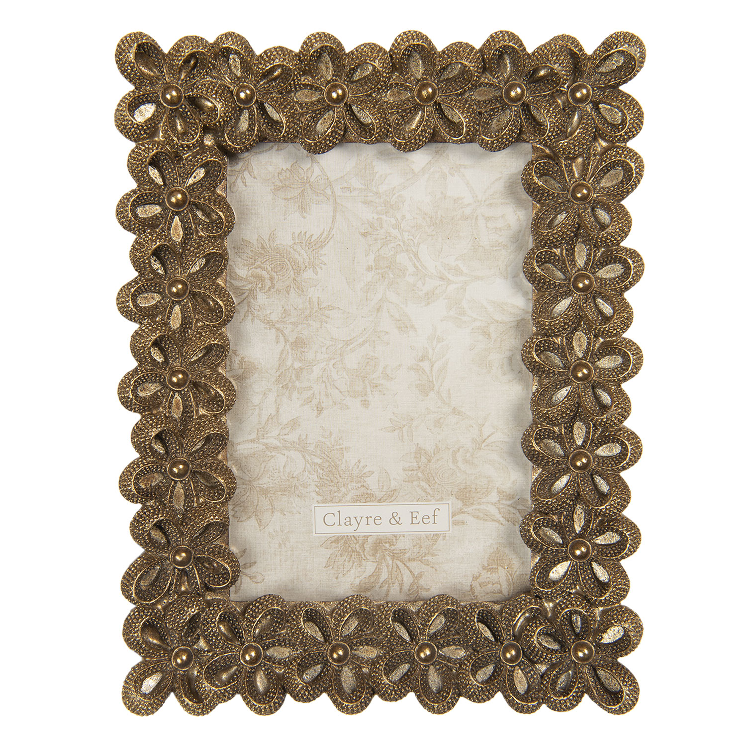 Valokuvakehys kauniilla kullanvärisellä kukkareunuksella. Kehykseen mahtuu 10x15 cm kuva vaaka- tai pystyasennossa. Kehyksen voi ripustaa seinälle tai laittaa pöydälle.