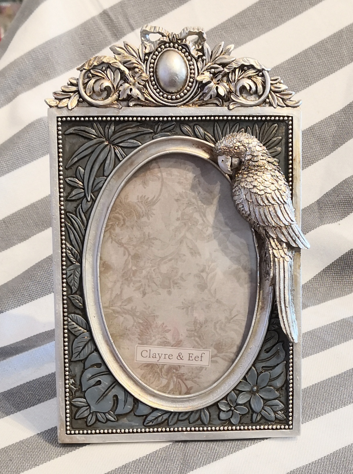 Kaunis harmaan sävyinen valokuvakehys, jossa kolmiulotteinen papukaija kuvan vierellä. Soikean kuva-aukon koko on n. 14x9 cm. Kehyksen ulkomitat ovat n. 23 x 14 cm.