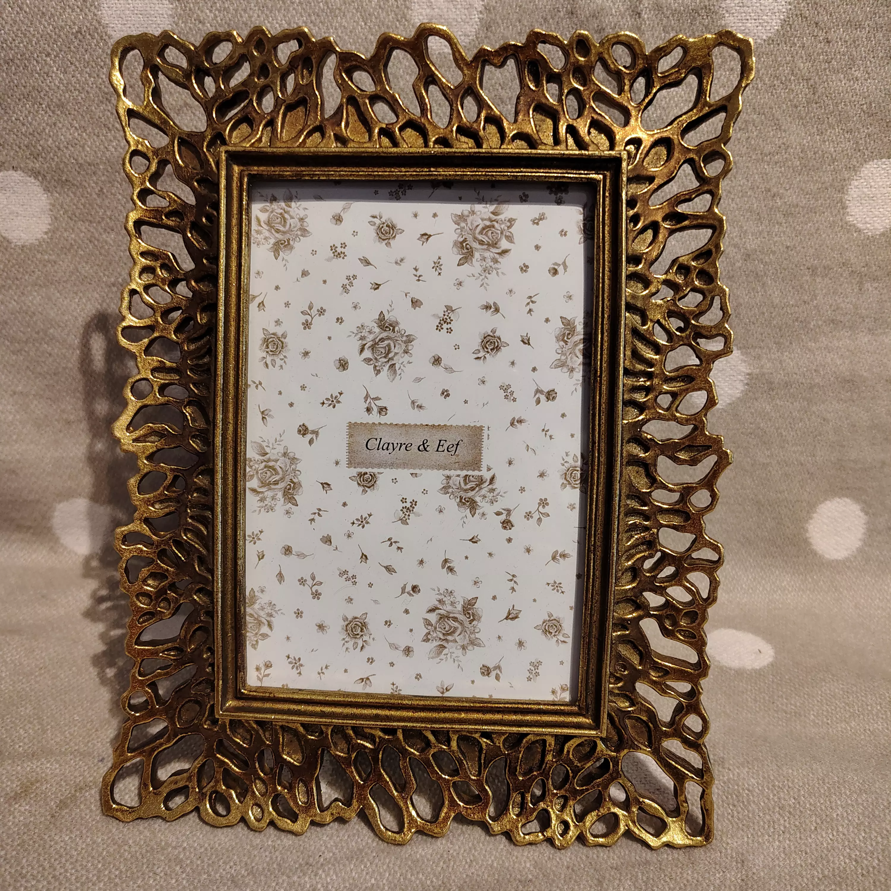 Kaunis valokuvakehys, jossa epäsymmetrinen kuparinvärinen reikäreunus. Kehyksen ulkomitat ovat 17x2x22cm, 10x15cm kuvalle.