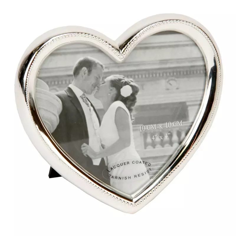 Sydämenmallinen valokuvakehys. Metallirunkoinen, hopeoitu. Reunuksessa kohokuviointikoristeet. Hopeointi on suojalakattu tummumisen estämiseksi.