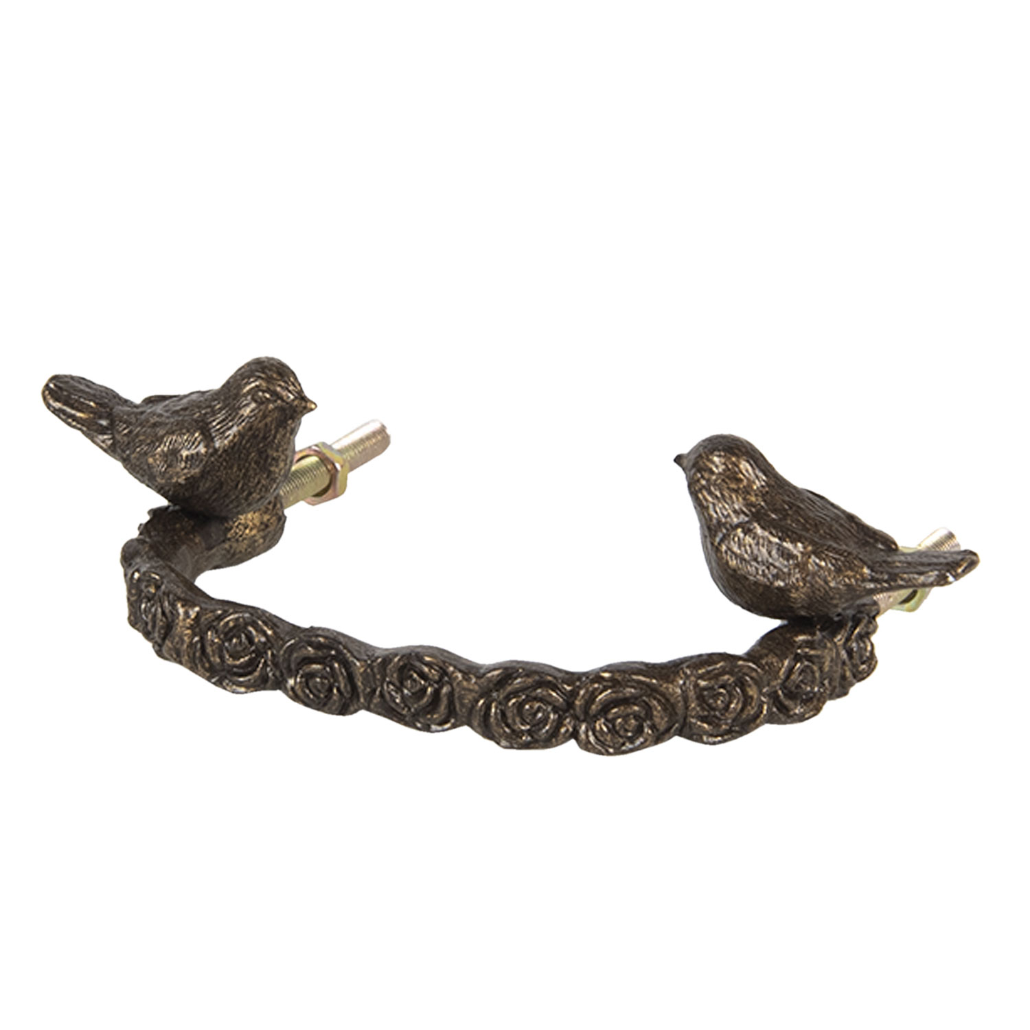 Kaunis kullanruskea rautakahva laatikon tai kaapin oveen. Linnut ja ruususomisteet. Kiinnitystappien väli n. 8,5cm ja tappien pituus 3,5cm. Kahvan kokonaismitat 13x3x8cm.