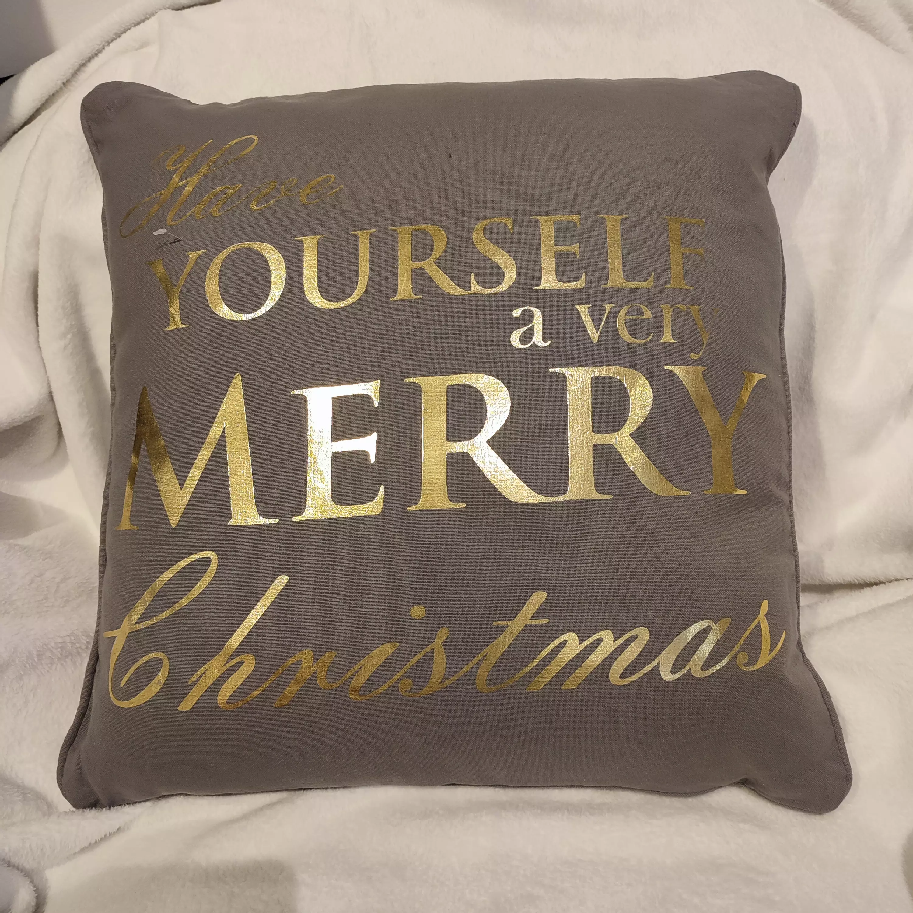 Joulutyyny kultaisella tekstillä "Have Yourself a Very Merry Christmas" harmaalla pohjalla. Vetoketju saumassa.