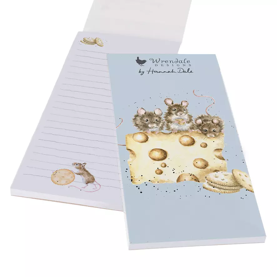 Wrendale "Crackers and cheese" ostosvihko / lehtiö kätevällä magneetilla, jolla lehtiön saa esim. jääkaapin oveen. Sopii erityisesti kauppalistan tekemiseen tai vaikka muistilehtiöksi. Kannessa hiiret herkuttelemassa juustolla ja kekseillä. Kannet on valmistettu ekologiselle kartongille ja sisäsivut on viivoitettu sekä osittain kuvitettu. Koko noin 21x10cm.