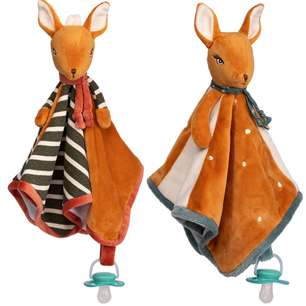 Bukowskin ihastuttava poro pariskunta Harald ja Helga nyt pehmeänä vauvariepuina. Koko n. 35x35 cm. Helga rouvan riepu koostuu ruskeista pilkullisista sekä valkoisista tilkuista ja Haradin ruskeista sekä vihreävalkoraidallisista tilkuista. Haraldilla on pienet sarvet päässä. Rievun alareunaan saa kiinnitettyä tutin.