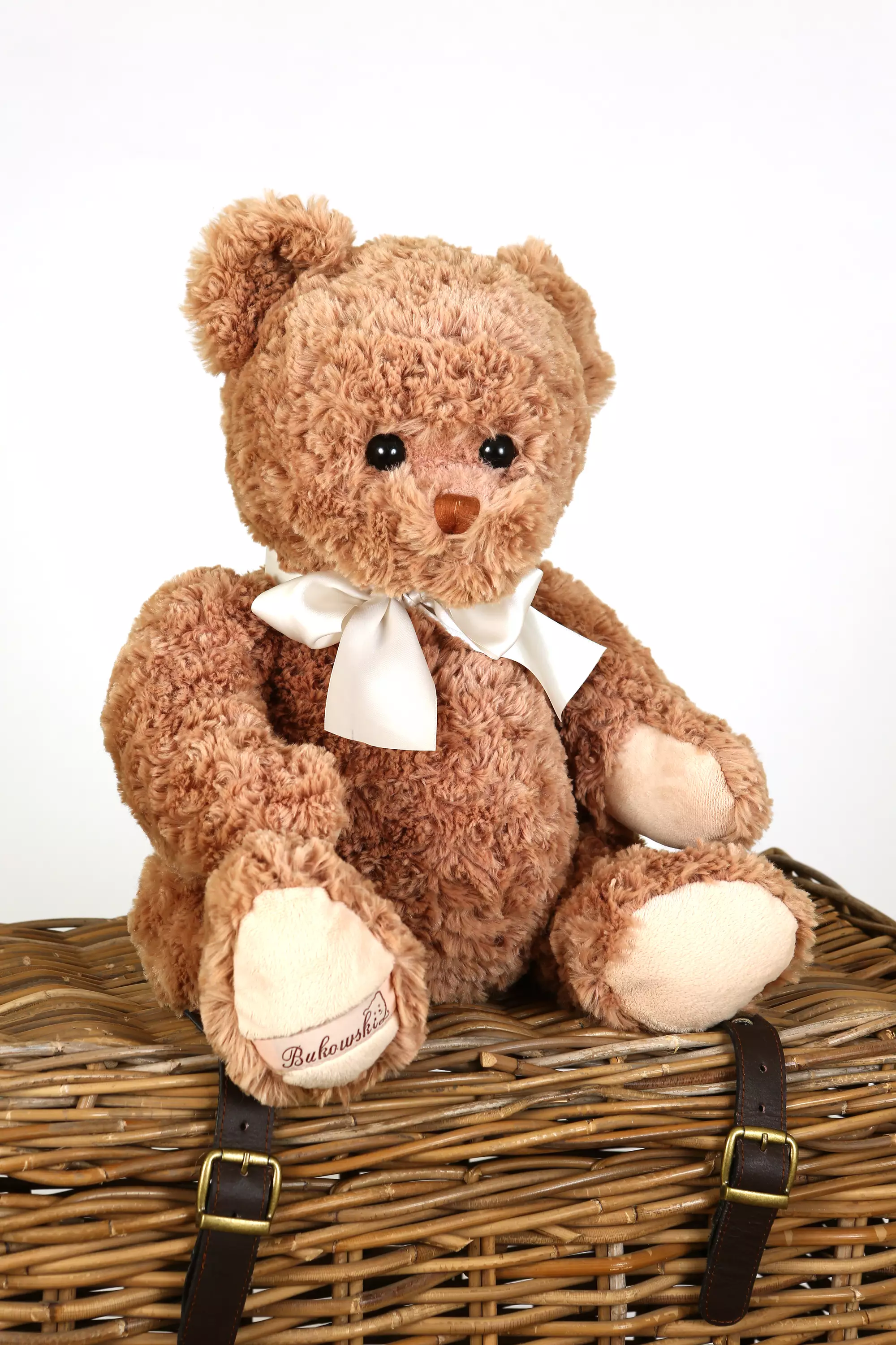 Bukowskin iso pehmoinen Hudson-nalle. Valkoinen rusetti kaulassa.
