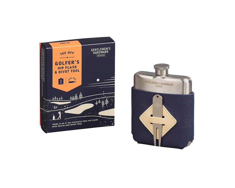 Gentlemen's Hardware Tee Off on golffarille loistava lahjaidea! Tyylikkäässä nahkataskussa on taskumatin lisäksi divot-työkalu golfkentille. Taskumatin tilavuus on 180ml. Taskumatti ja divot ruostumatonta terästä, tasku tekonahkaa.