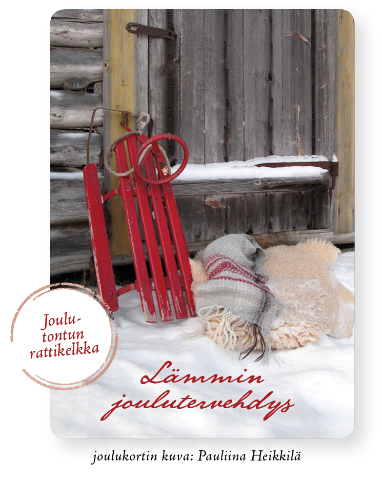 Onkohan tonttu lähtenyt talvipäivän kelkkaretkelle? Rattikelkka, lampaantalja ja villainen kaulahuivi kelkkaretken tauolla ladon seinustalla. Lämpimän tunnelman joulukortti.