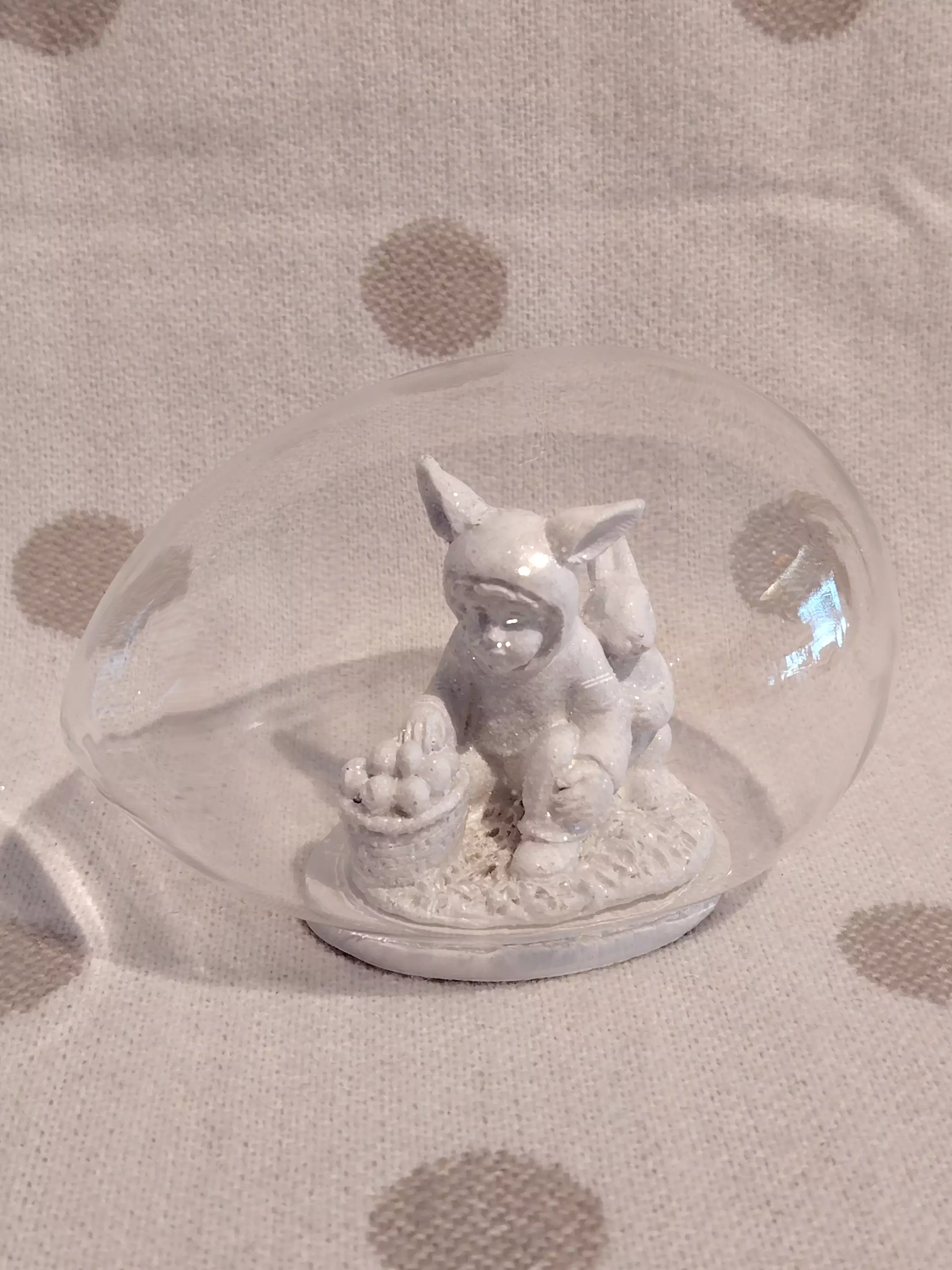 Kaunis pääsiäiskoriste, pupuasuinen lapsi munajahdissa pääsiäispupun kanssa munanmuotoisen lasipallon sisällä. Munan koko on n. 11x8x7,5cm.