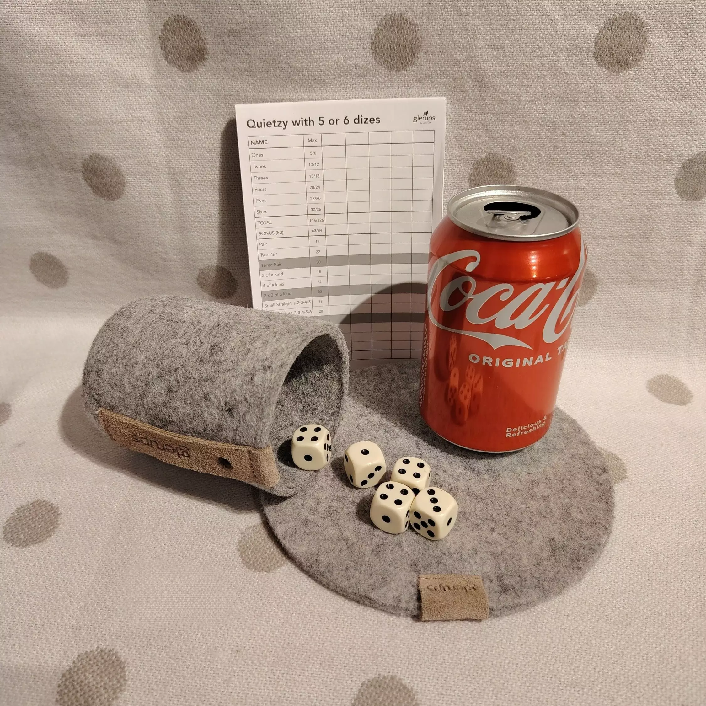 Upea huopasetti tutusta noppapelistä. Tässä singlepakkauksessa on taattua Glerups laatua oleva huopainen juomacooleri / nopparavistusastia, huopainen alusta, nopat 6 kpl ja quietzy pistetaulukkolehtiö, kaikki näppärässä kangaspussissa.