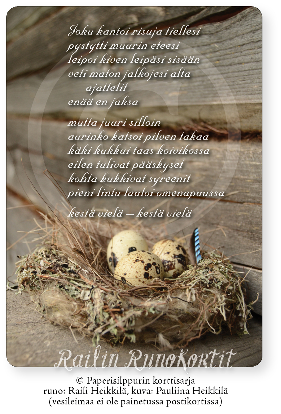 Tarvitsetko voimaa tai rohkaisua? Haluatko antaa ystävällesi postikortin, jonka ajatus kantaa pitkään? Tämä tunnelmallinen Railin Runokortti kannattelee vaikeuksien yli hieman pidemmällä runolla: