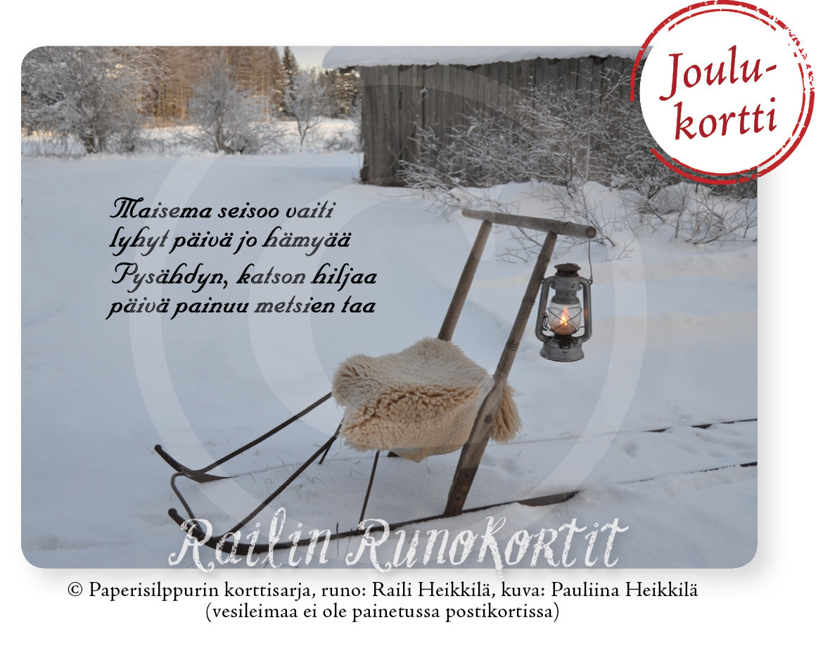 Railin Runokortti -sarjaan kuuluva A6-koon joulukortti, jonka taustapuolella on Hyvää Joulua ja Onnellista Uutta Vuotta -toivotus. Tukevaa, suomalaista kartonkia. Mukavana yksityiskohtana pyöristetyt kulmat. Railin Runokorteilla on Suomalaisen Työn Liiton Avainlippu. Kortin kuvassa mummun potkukelkka ja lyhty Honkajoen Rynkäisten kylässä. Runo: Raili Heikkilä, kuva: Pauliina Heikkilä. Vesileimaa ei painetussa kortissa.