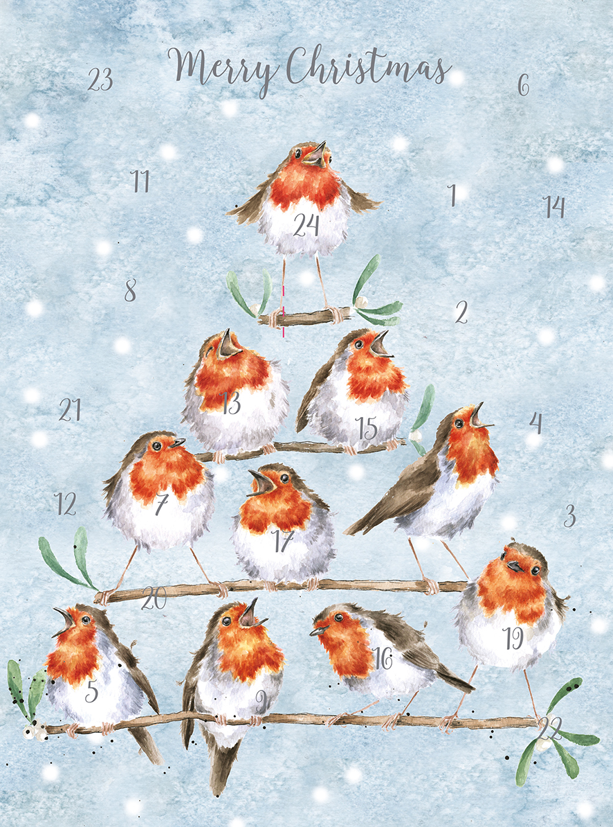Kaunis A4 kokoinen joulukalenteri Wrendale kuvituksella. Joulukalenterin mukana tulee kirjekuori.